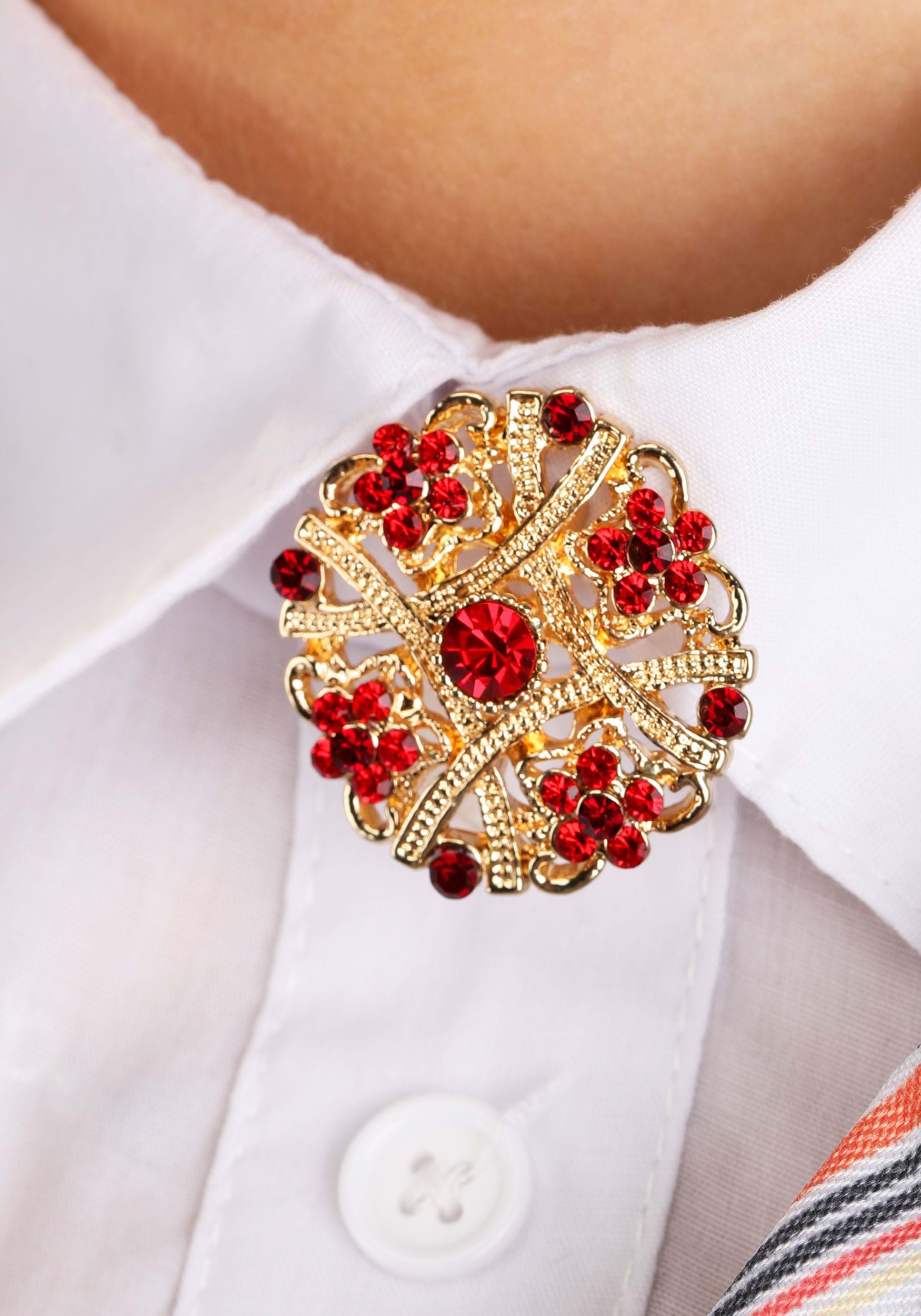 - Woven cotton shirt has buttons down center front, jersey knit panel on the back, gold with red jewels on the brooch