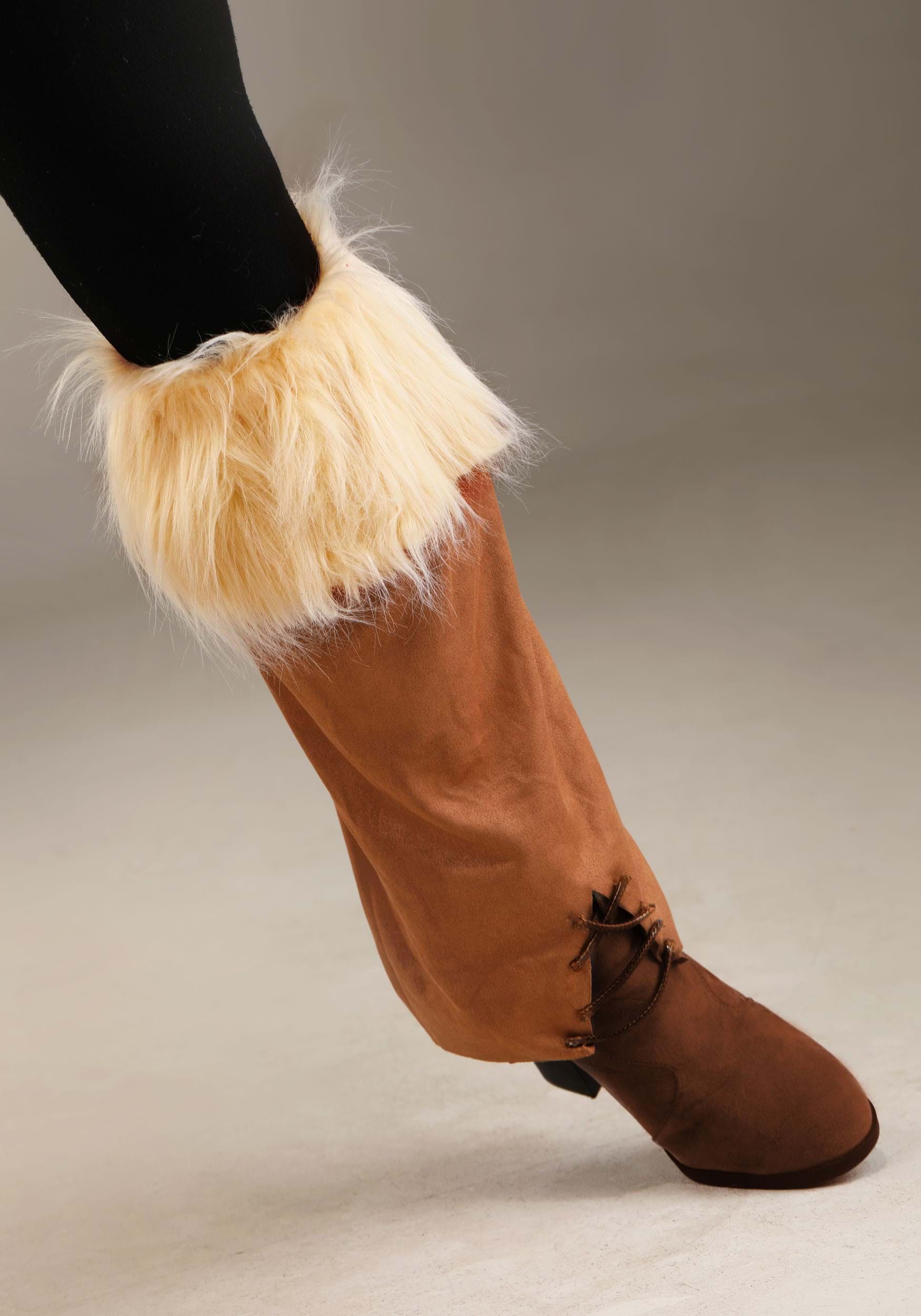- Faux suede boot tops have faux fur, elastic in the tops to secure to legs