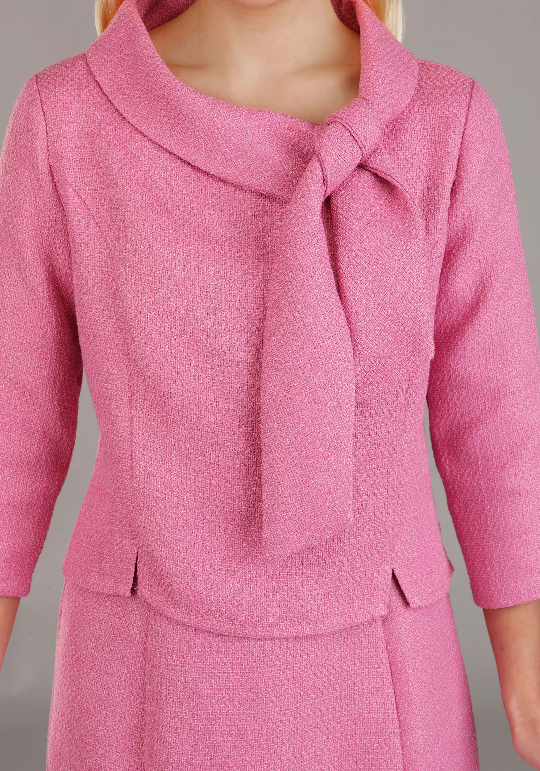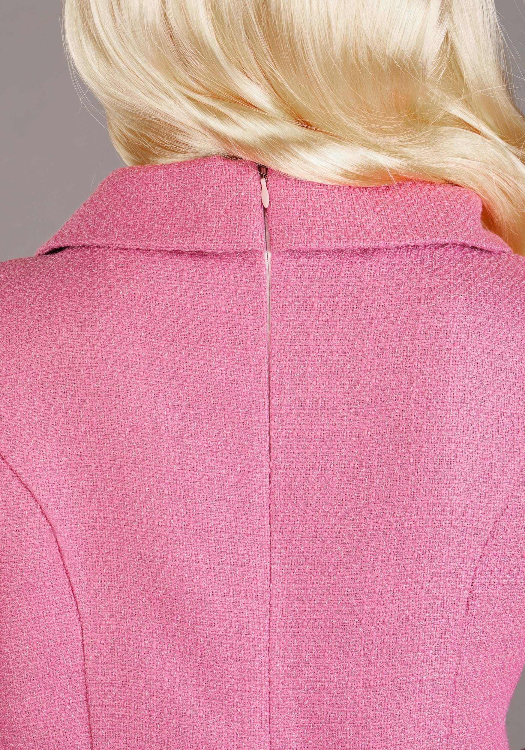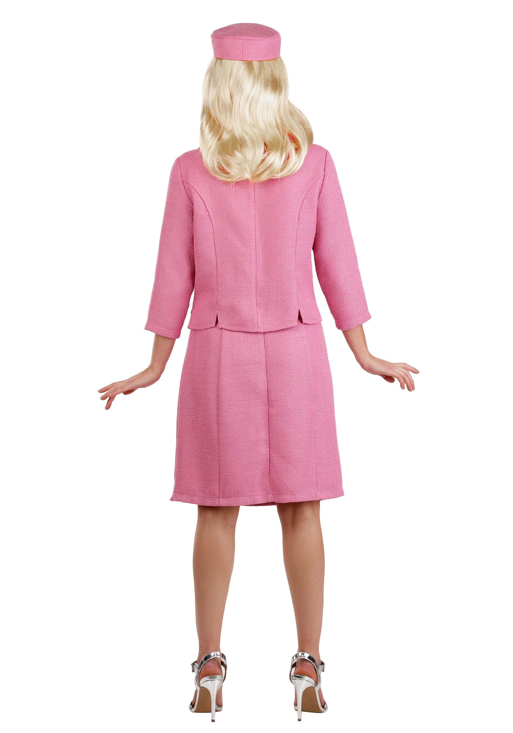 This officially licensed ensemble comes with a matching pink jacket, skirt, and pillbox-style hat. The jacket features three-quarter sleeves, a stylish attached necktie, and a clean, structured silhouette. A back zipper keeps the fit sleek while maintaining that iconic Elle polish. The coordinating skirt is designed with crisp seams and subtle pleating for a tailored, professional finish.