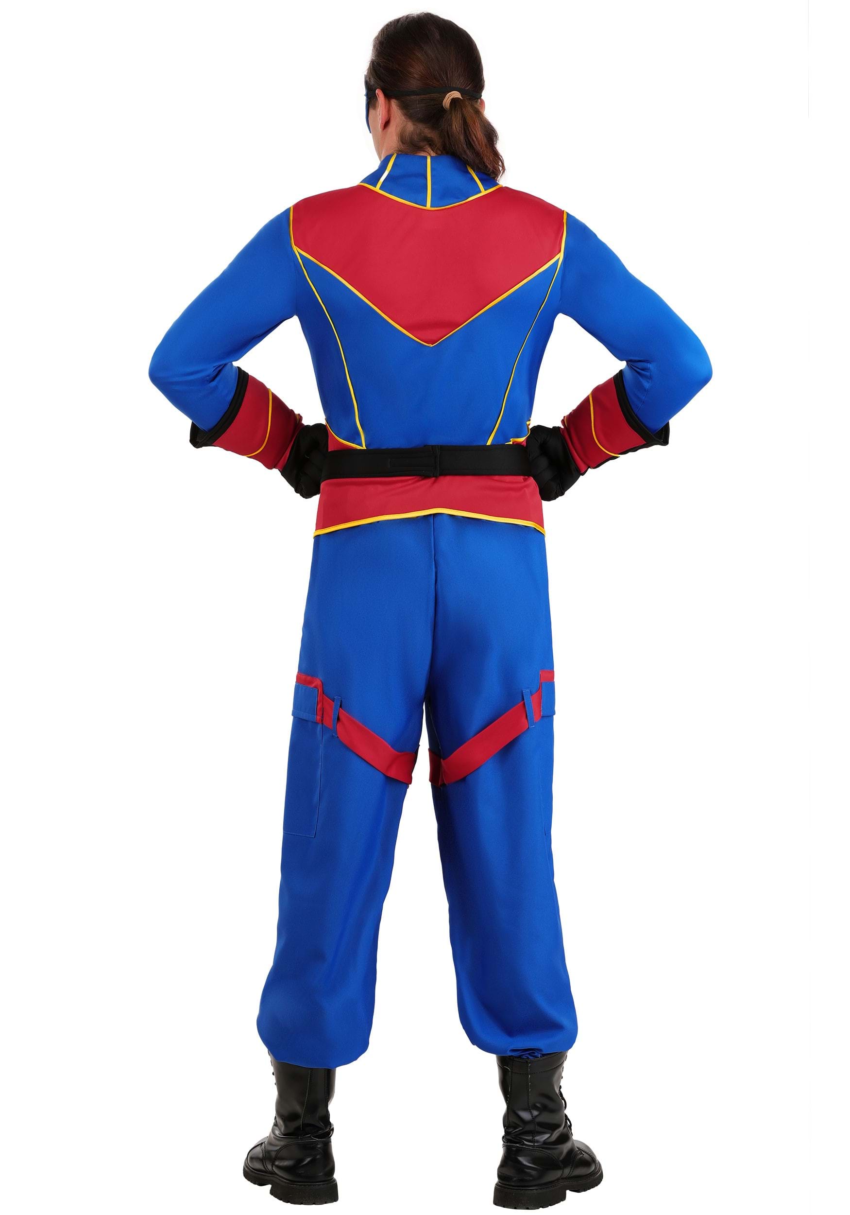 This five-piece costume includes a shirt, pants, belt, gloves, and mask. The shirt is made of jersey material with a blue base, red accents, and yellow piping that matches Captain Man’s signature look. It zips up the front for easy wear and stays flexible for full-range heroic movement. The pants match the shirt in color and design, and they fit with an elastic waistband for a snug yet comfortable feel.