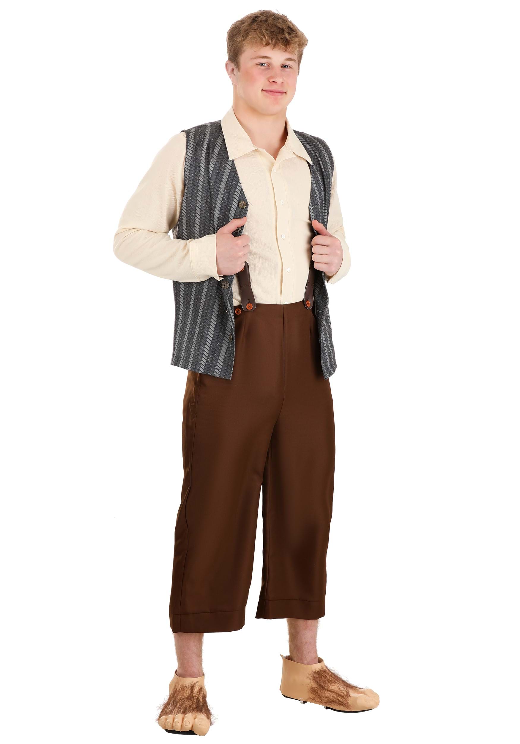 Be the hero who saves Middle-Earth when you wear this officially licensed Samwise Lord of the Rings Men's Costume! Do the Gamgee family proud in this exclusive outfit. It includes a shirt with long sleeves that looks great under the blue and gray vest that fastens with front buttons. Brown pants that are comfortable enough for long treks and a green cloak that fastens at the throat with a pin the Elves gave you complete the look. Finish off with the Hobbit feet shoe covers!