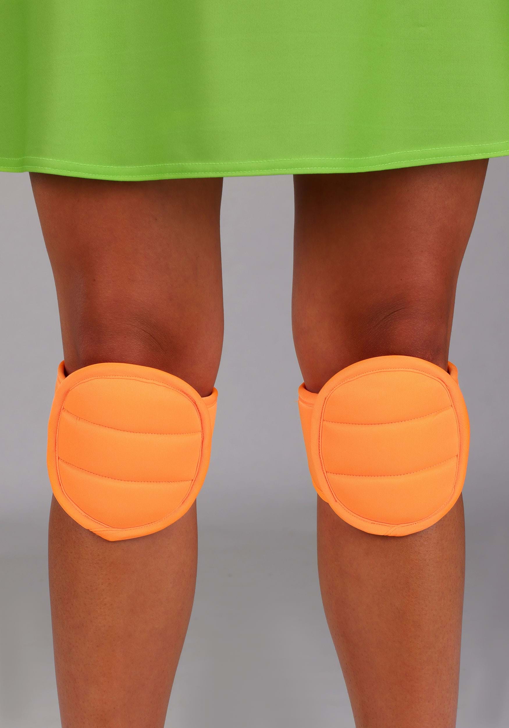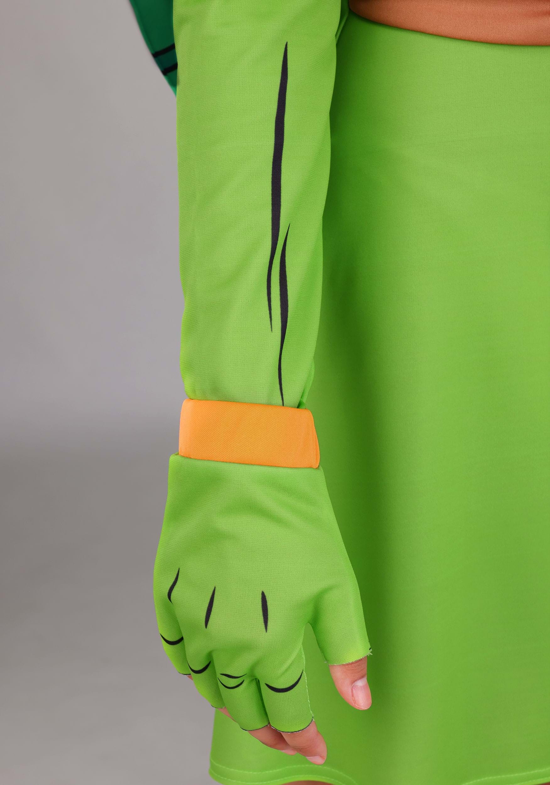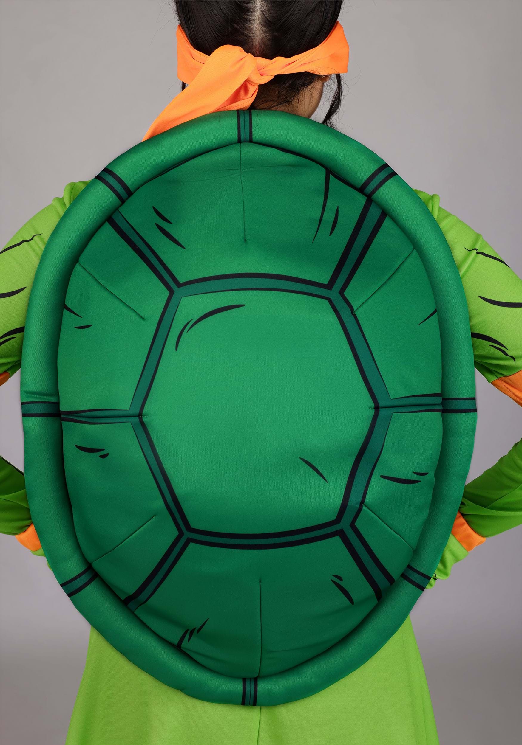 The dark green shell straps on with a translucent shoulder band, so it stays put while you snack, twirl, or ninja-kick your way through the day. Orange accessories complete the look: a tie-on eye mask, fingerless gloves with matching wristbands, arm bands, and a pair of foam knee pads so you can go full turtle mode without sacrificing flair.
