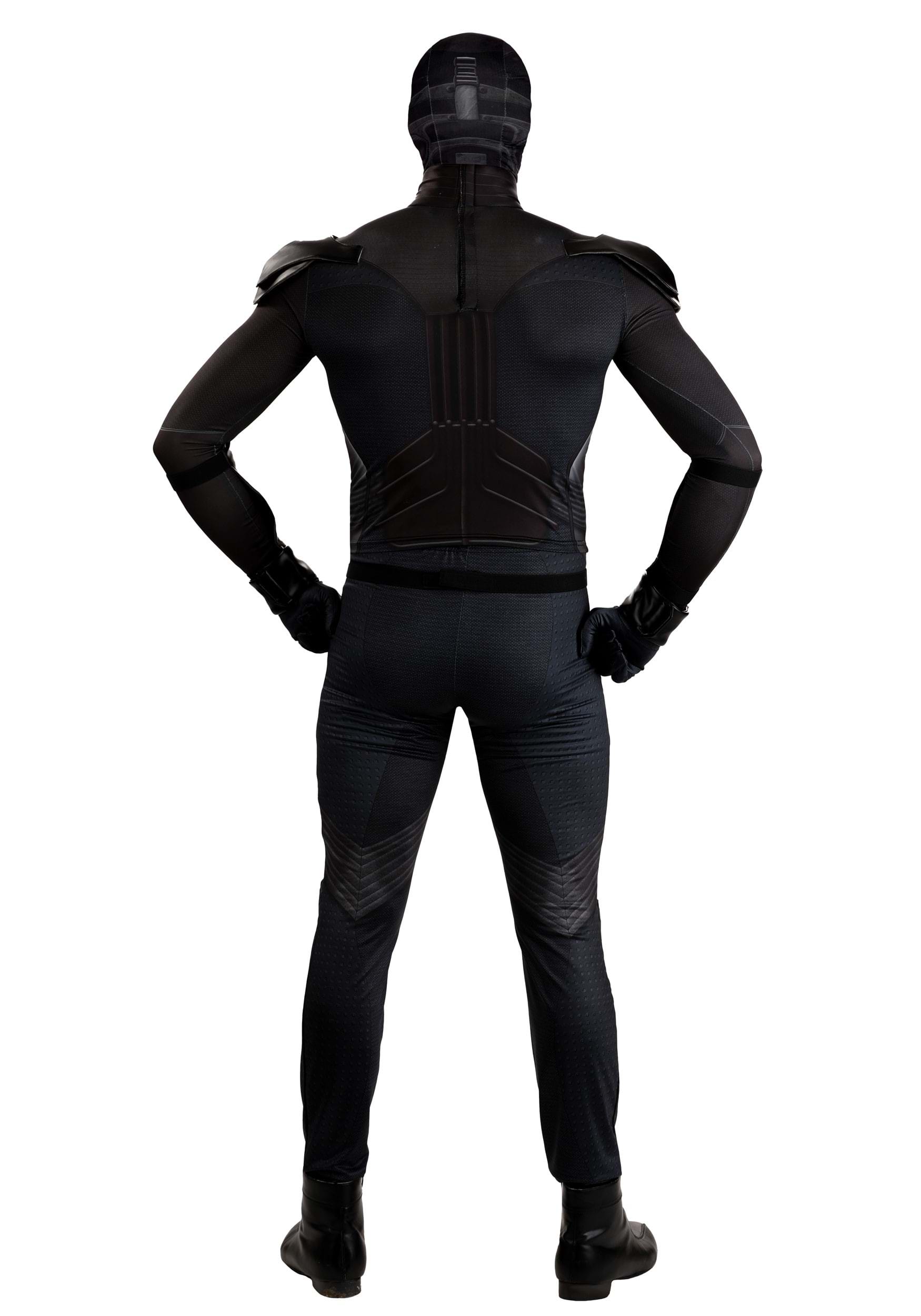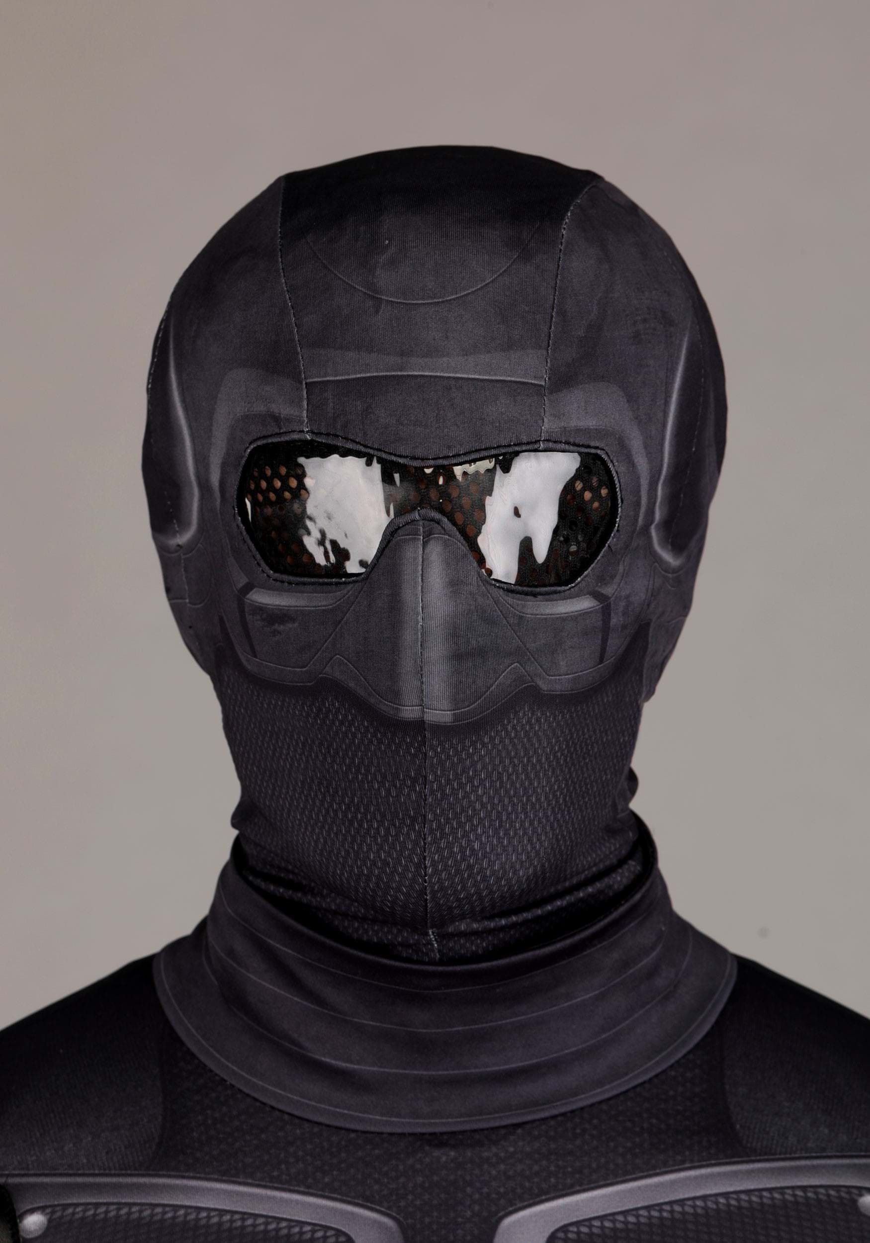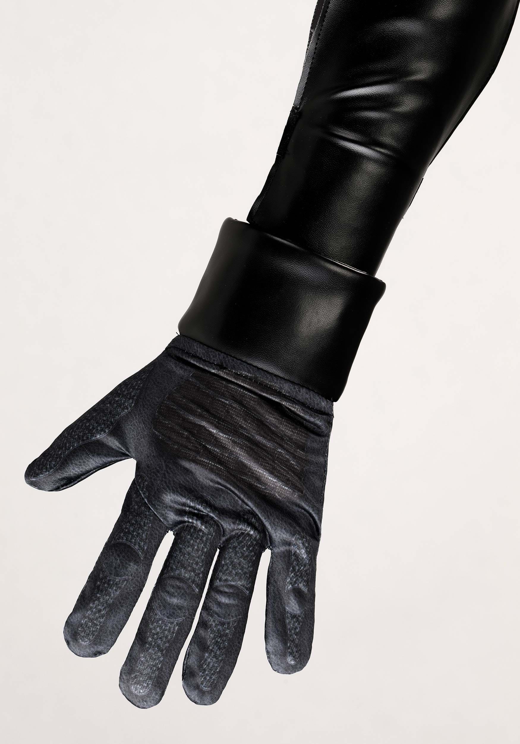 The included gloves are made of faux vinyl and match up perfectly with the foam gauntlets, adding to the full-on “I mean business” vibe. The gaiter mask slips over the head and covers the neck, while the sculpted helmet finishes the look with large, unblinking eye details—because nothing says “intimidating” like staring straight ahead without blinking once.