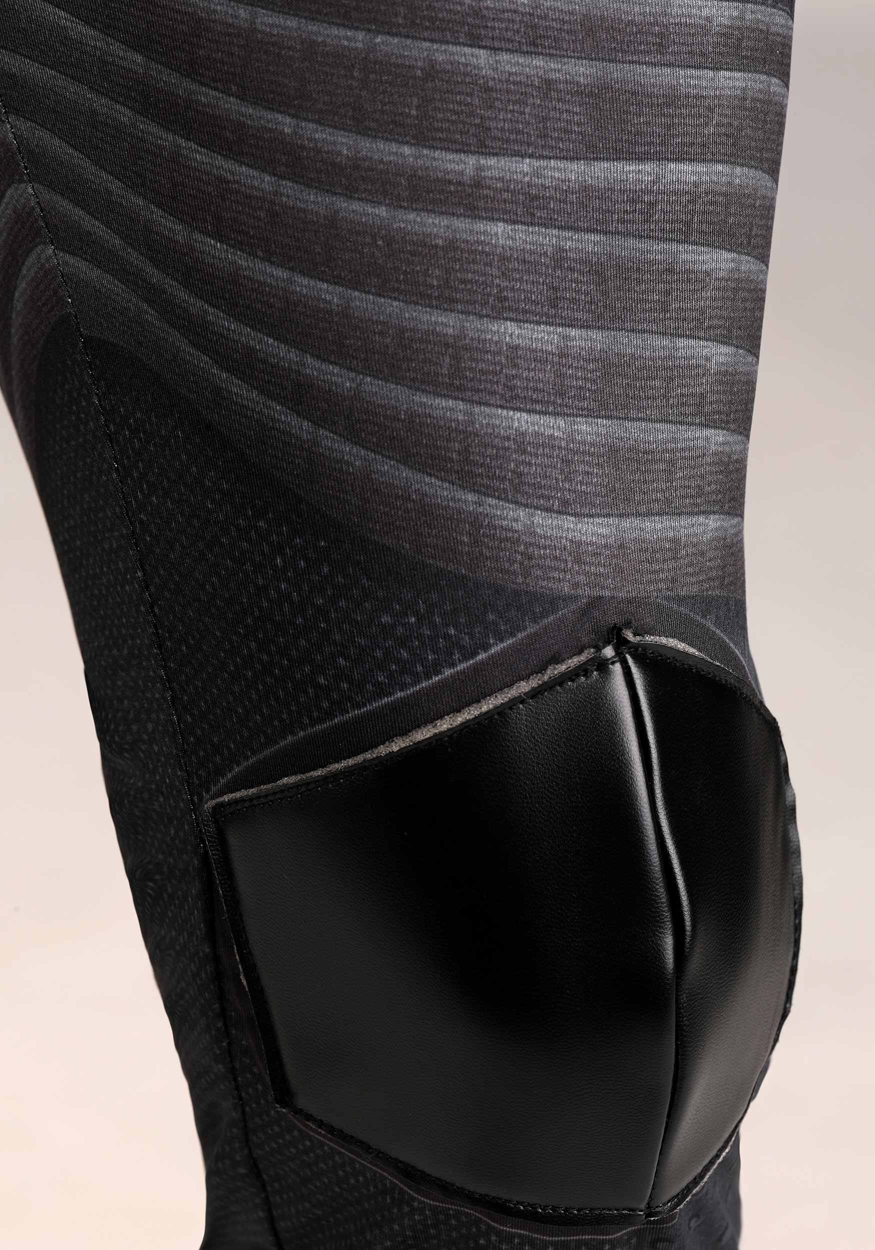 - Sublimated print, spandex pants have an elastic waistband, faux vinyl knee pads sewn on