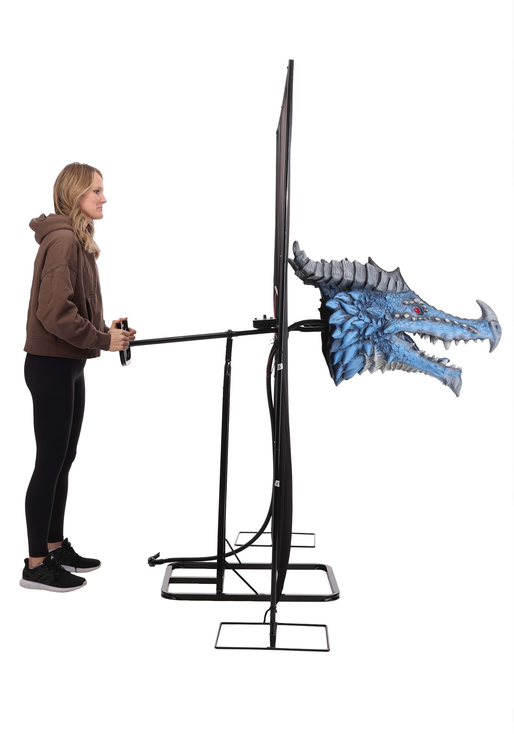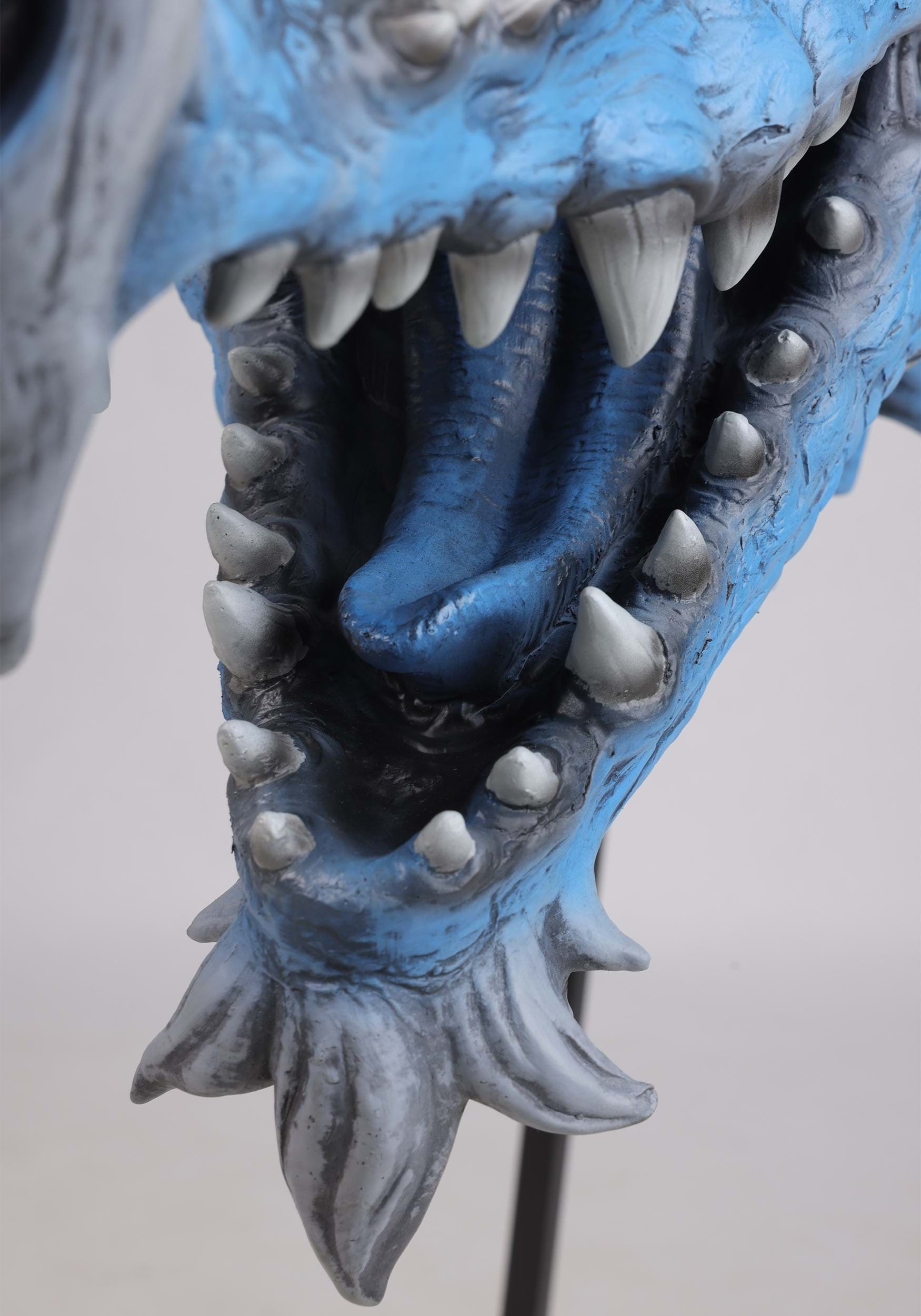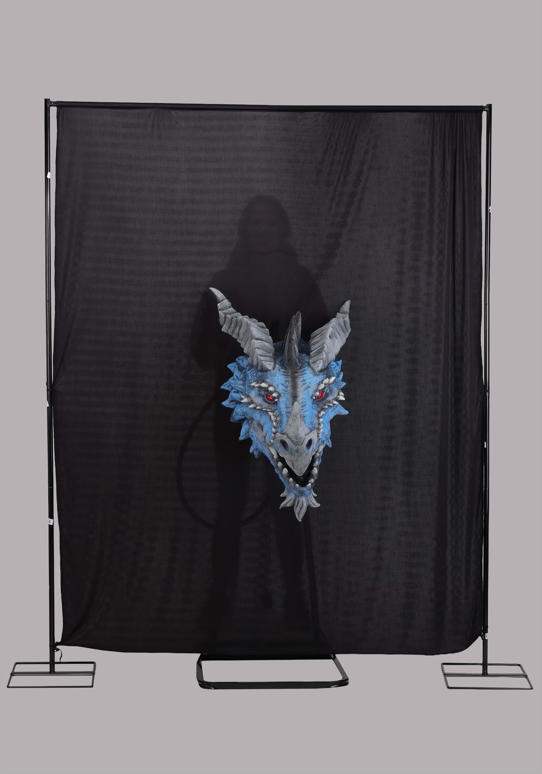 This actormatronic decoration stands 3 feet tall and features a blue dragon head mounted on a sturdy metal frame with fabric backdrop. Crafted from high-quality foam with highly detailed painted graphics, the dragon showcases icy blue scales, menacing horns, and fearsome teeth. Red LED eyes light up to complete the predatory effect. Our in-house design team made sure every scale and spike captures that perfect balance of fantasy and fright.