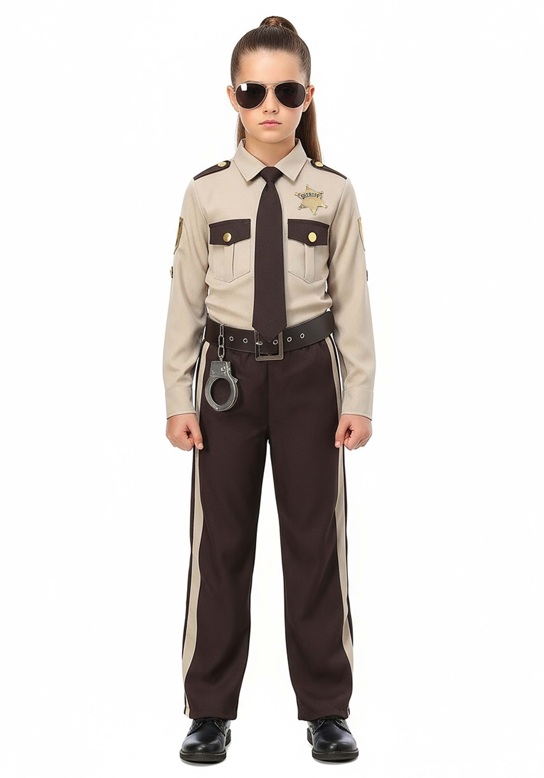 Thanks to a profound interest in all things fashion, our in-house design team has scoured everything from vintage to futuristic officer looks and put together this exclusive Sheriff Costume for kiddos. Your young law enforcement agent is going to look amazing in this shirt, pant, and accessory combo. The shirt is a uniform-style beige long-sleeved shirt with two front breast pockets and embroidered law enforcement patches on the arms. The pants match the dark color of the breast pockets except for a lighter stripe down the side.