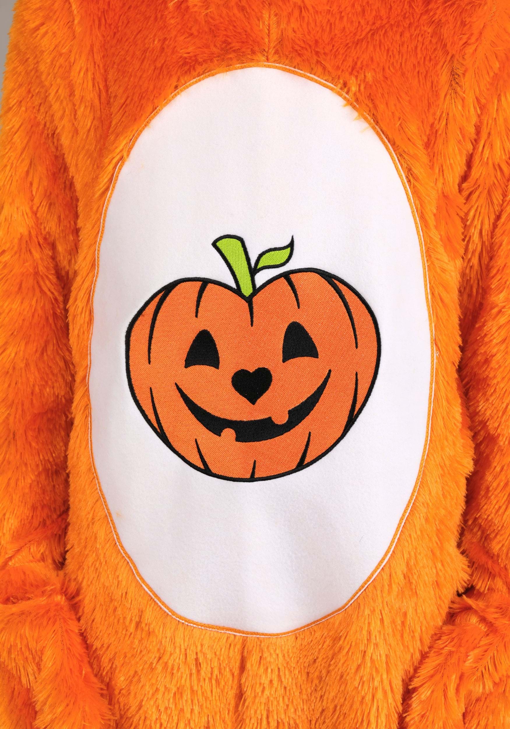 The costume is a cozy orange jumpsuit, covered in bright faux fur and featuring a back zipper for easy in and out. The tummy features an appliqued jack-o'-lantern symbol, and the Care Bears logo on the backside gives it that extra "Yep, it's official" touch.