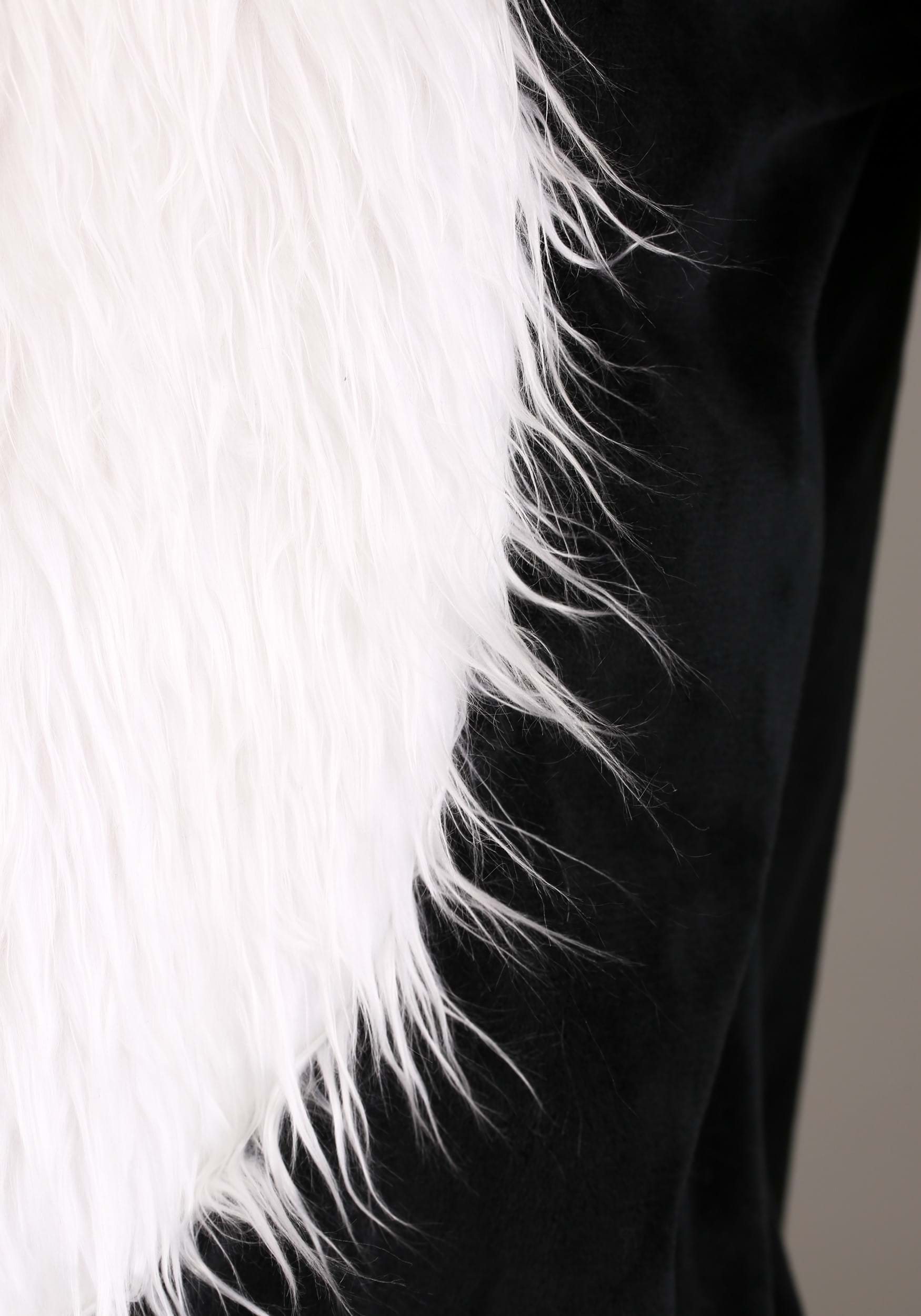 - Velour jumpsuit has faux fur belly inset, foam-backed bow tie at front neck
