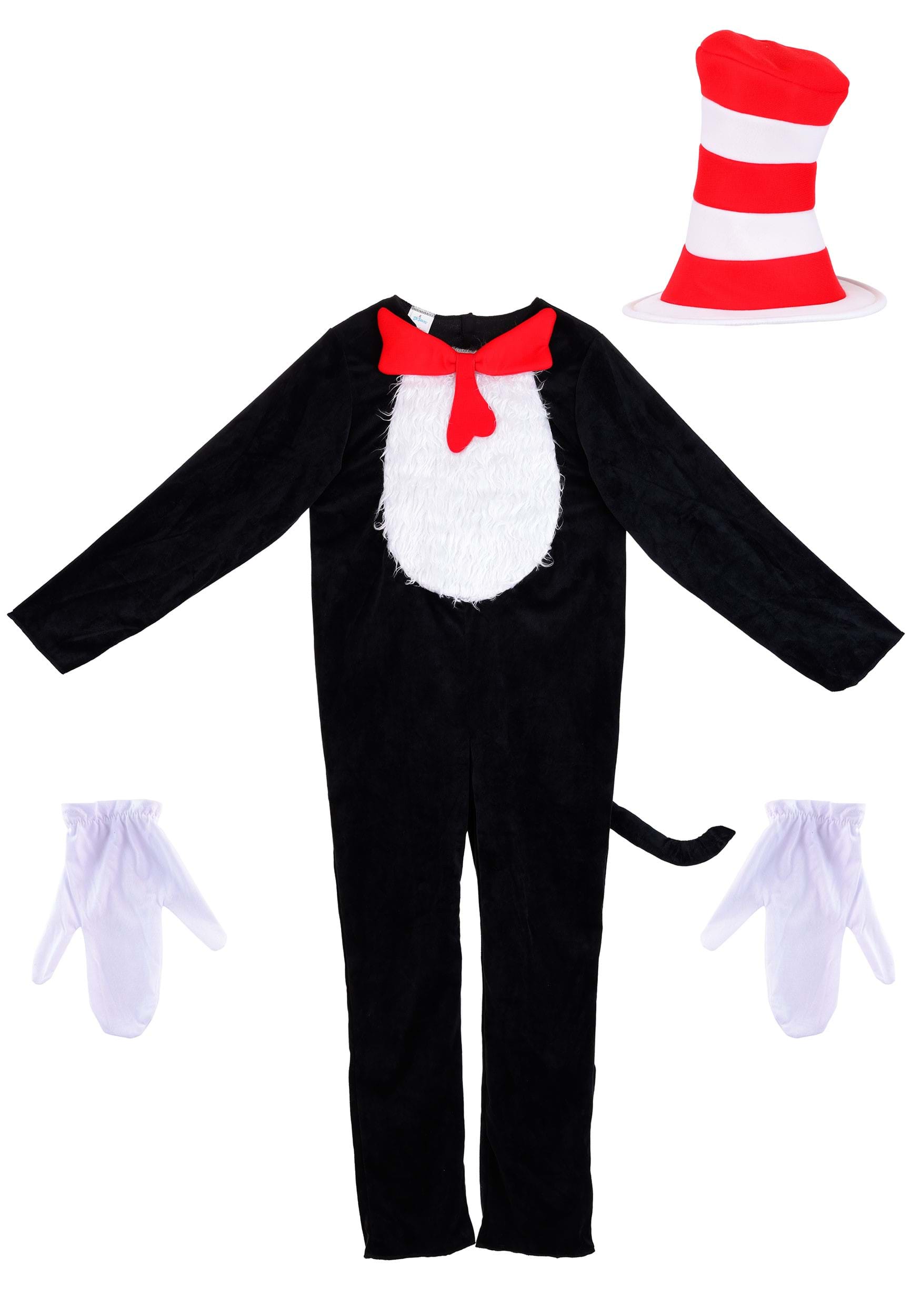 This black jumpsuit features an attached stuffed black tail, a white faux fur belly patch, and an oversized red bow tie, just like the real Cat in the Hat! The outfit also comes with an oversized striped hat with a clever pocket in the lining, so you can carry your valuables without changing the look. The white gloves complete the transition!