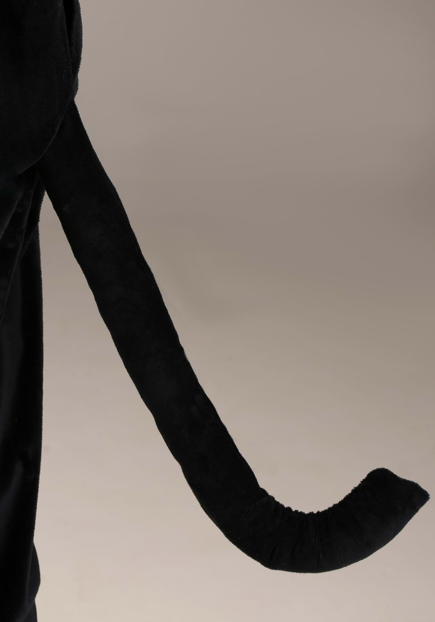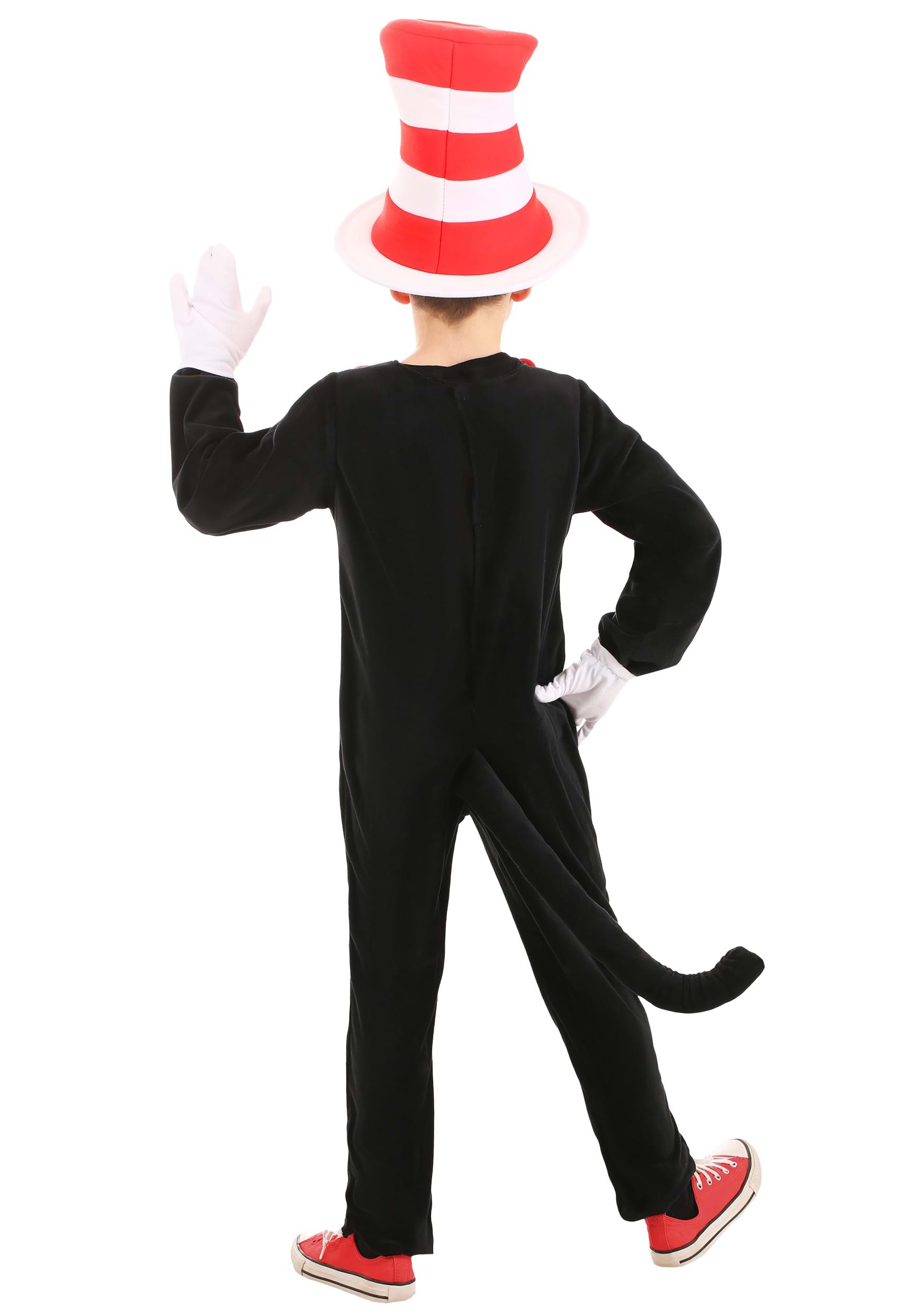 This storybook-inspired costume is a black jumpsuit with a long cat tail. A furry chest piece in white is topped with the cat's signature big red bow, and the red and white striped, oversized top hat is also part of the Cat's iconic look. Little gloves complete the transformation!