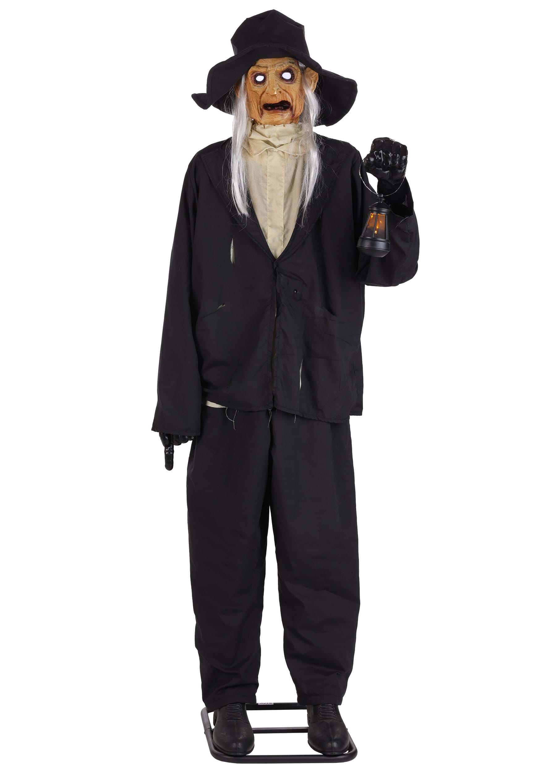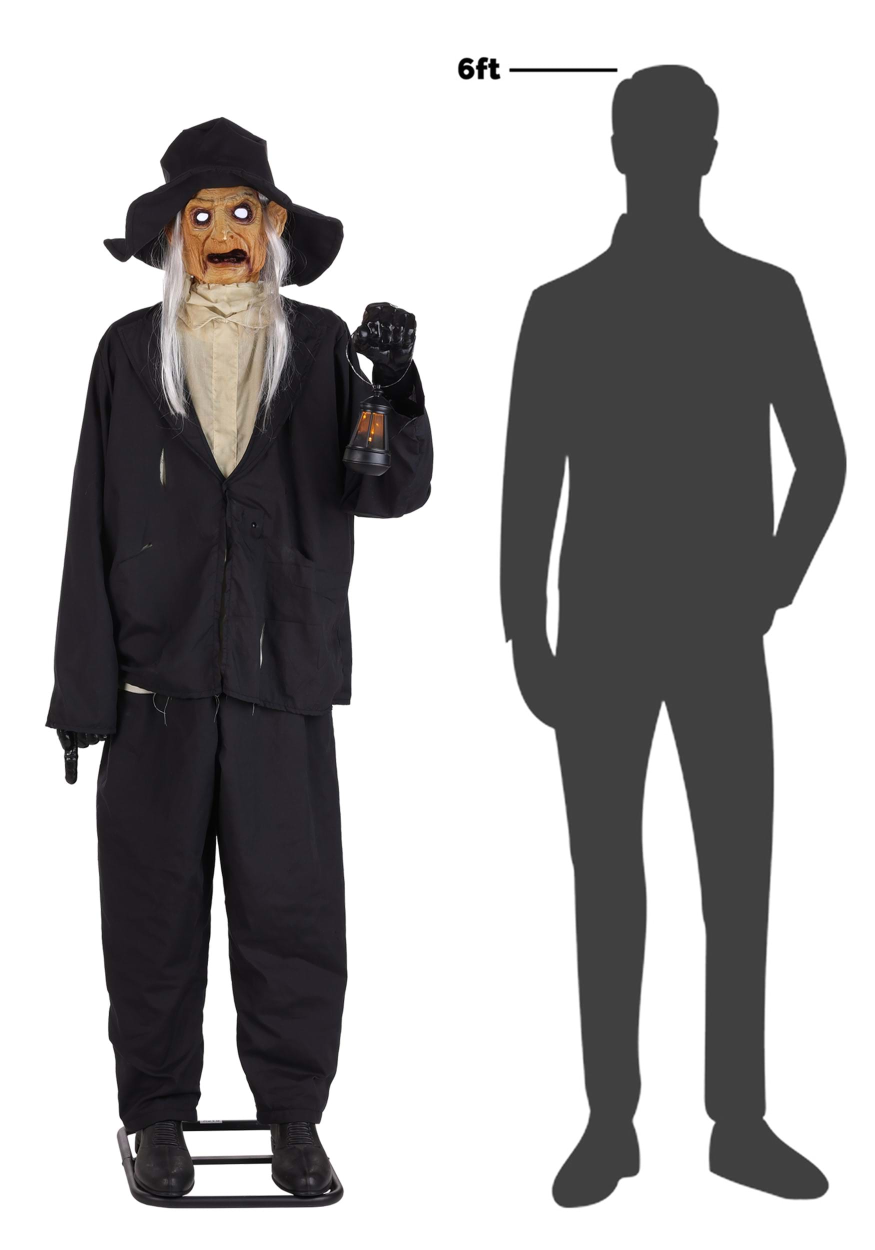 Standing an imposing 6 feet tall, the Ghastly Gravedigger comes equipped with a metal stand, polyester cloak, and a face only a cemetery could love. His head turns side to side while his lantern and eerie white eyes glow in sync. His mouth moves as he delivers spine-tingling lines like, "Do you not see where you walk?" You know, lines that are just perfectly designed to spooking guests and mail carriers.