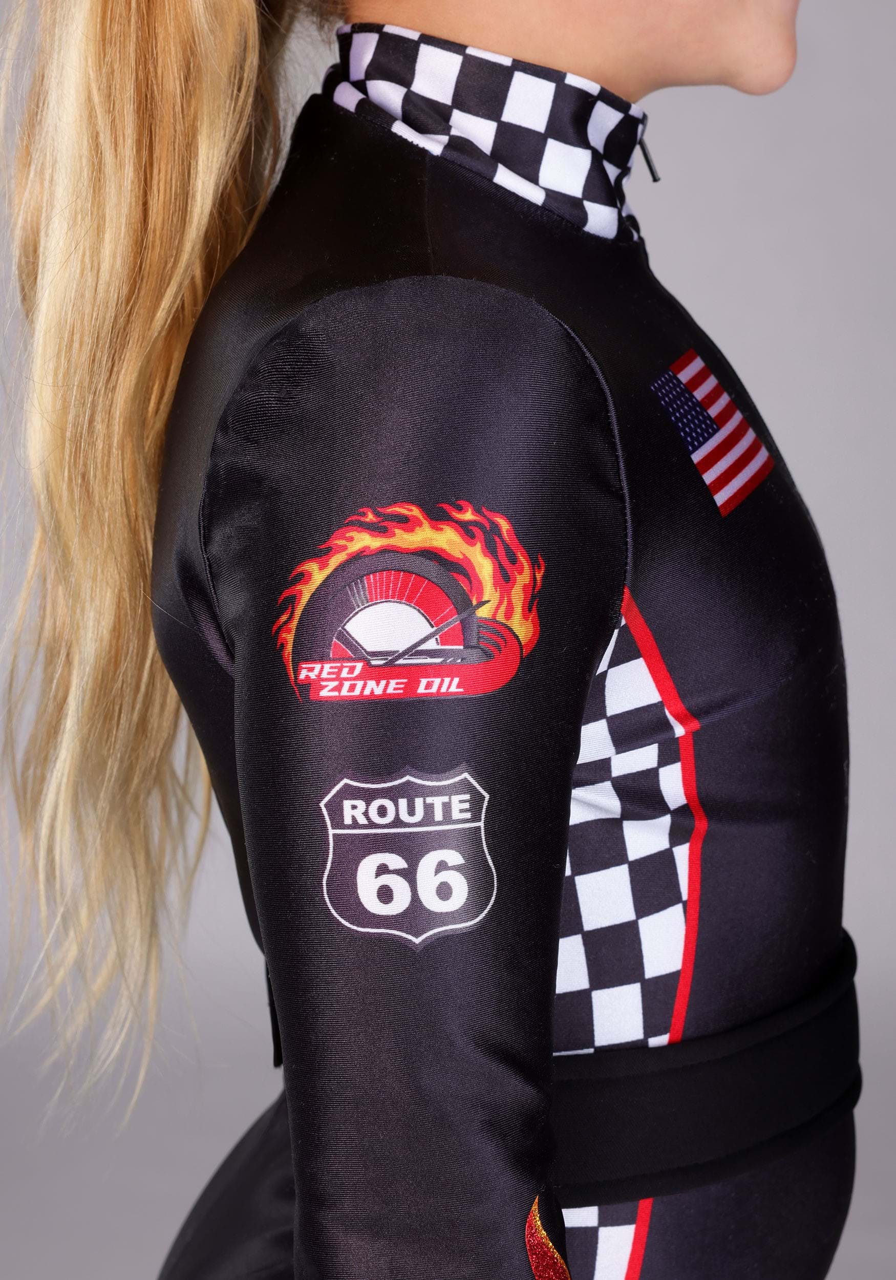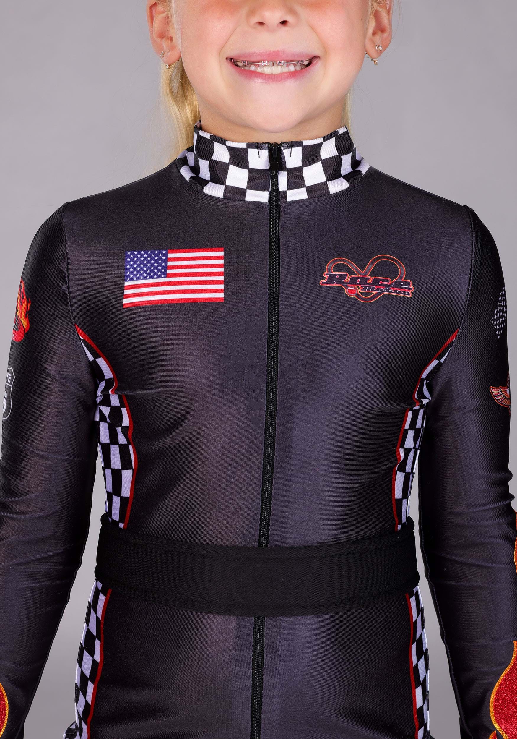 This is an exclusive Girl's Fiery Race Car Driver Costume.