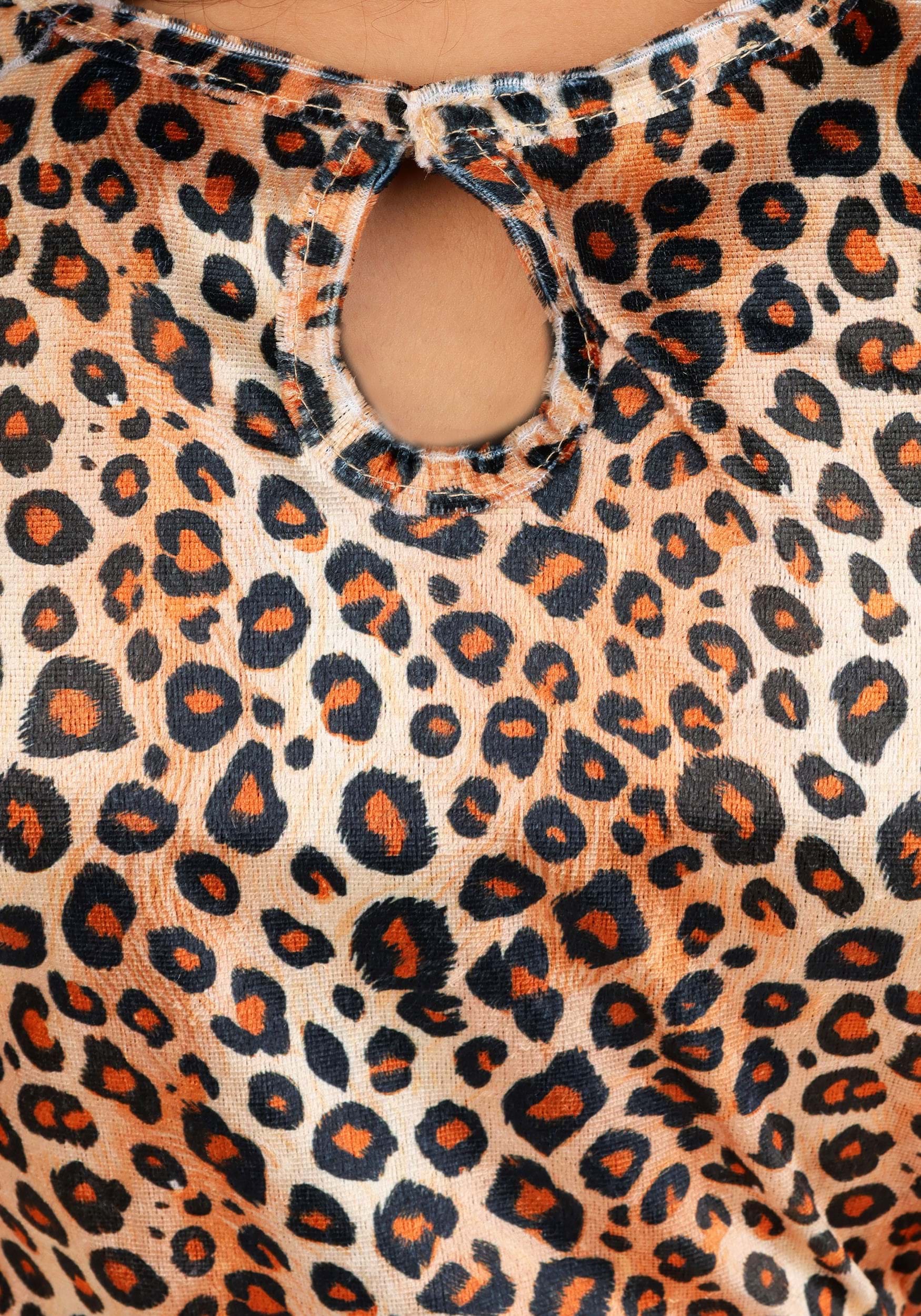 The velour dress features a hook-and-loop fastener at the center back, making costume changes quick and easy. A tan front inset panel pops against the rich brown leopard print, adding extra dimension and style to the dress. Sleeve cuffs and the hemline are edged with ruffled, fringed glittery tulle for a fun shimmer with every twirl.