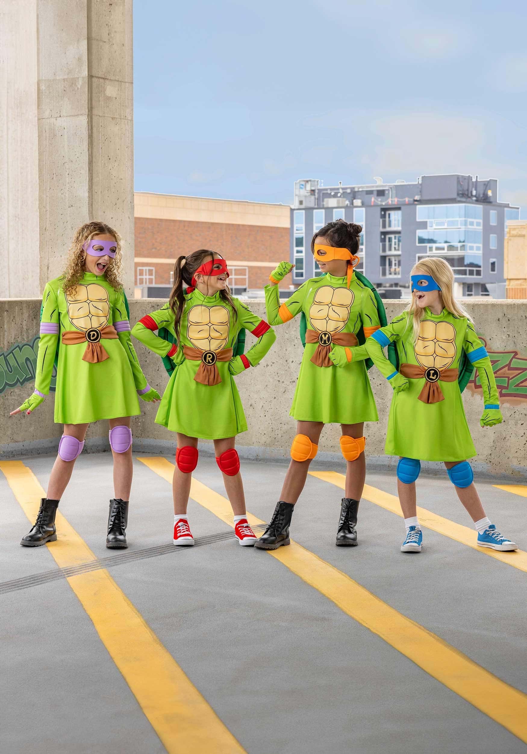 The green dress is crafted from a mix of ponte and jersey knit fabric, making it comfy enough for a candy sprint and sturdy enough for backyard ninja missions. It zips up in the back and features a printed front shell and faux belt with Donnie’s unmistakable “D” badge. The detachable shell secures to the back, giving her full Turtle transformation powers in seconds.