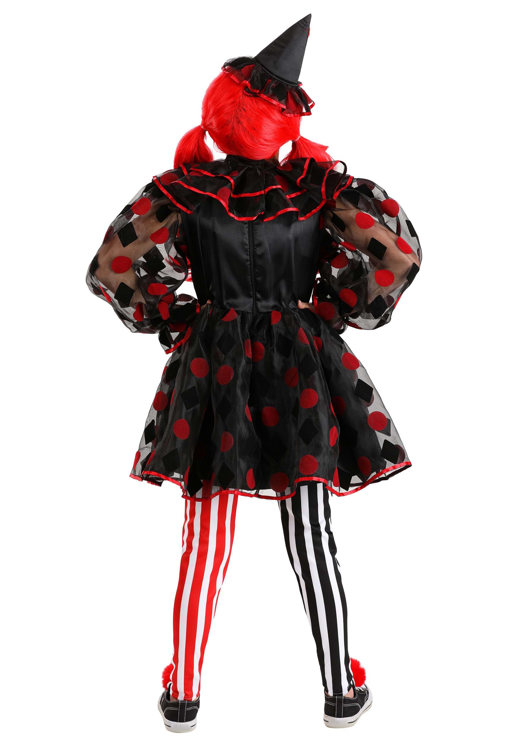 - Black satin skirt of dress has a flocked organza layer with velour polka dots and red satin trim