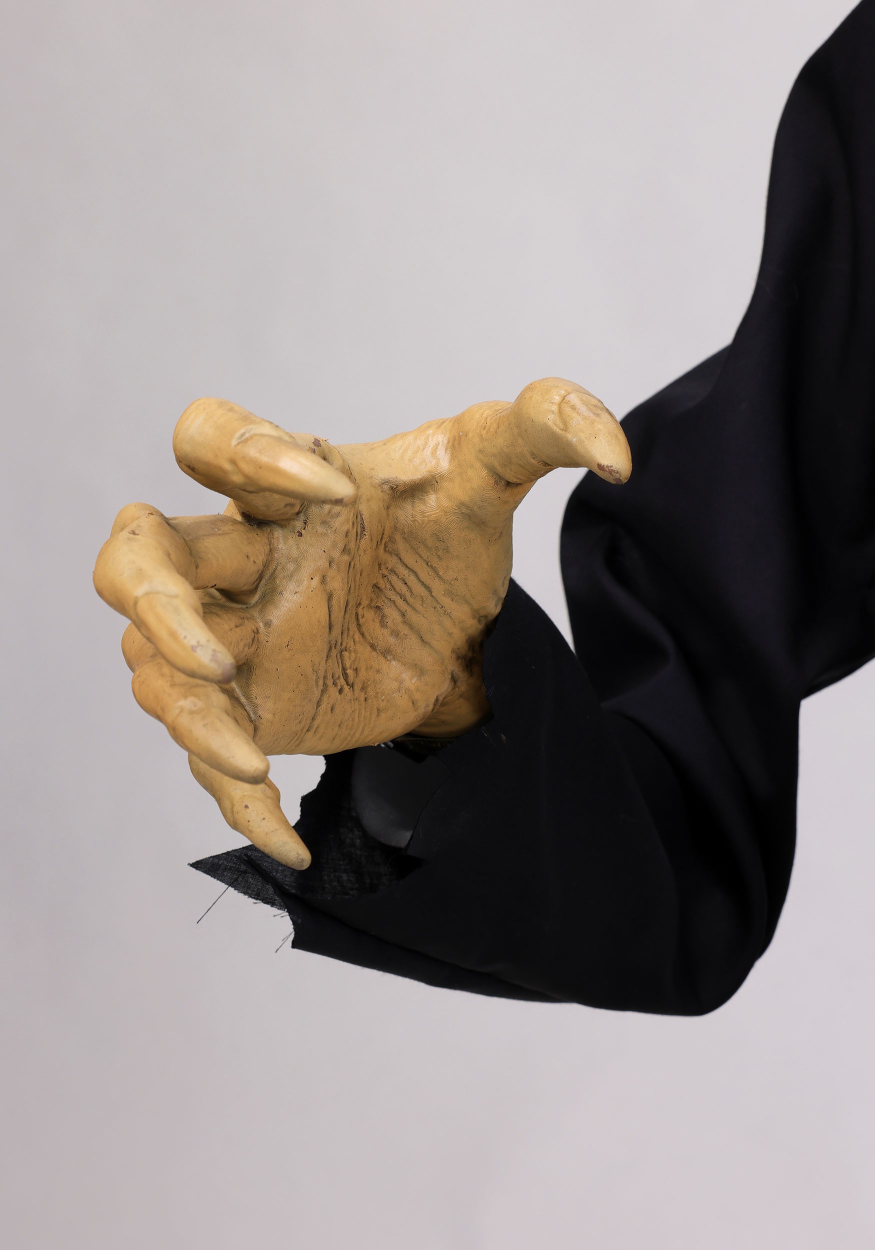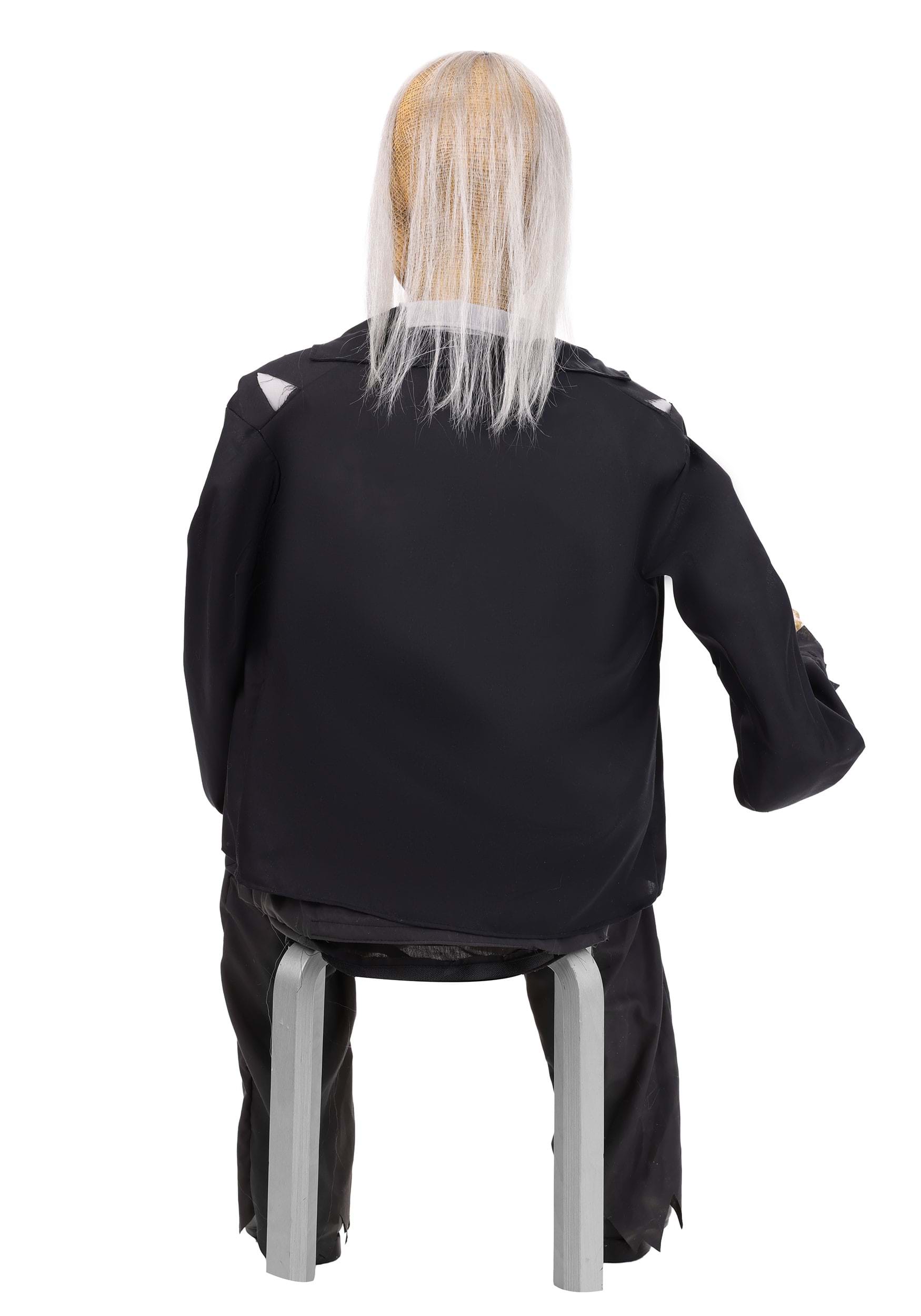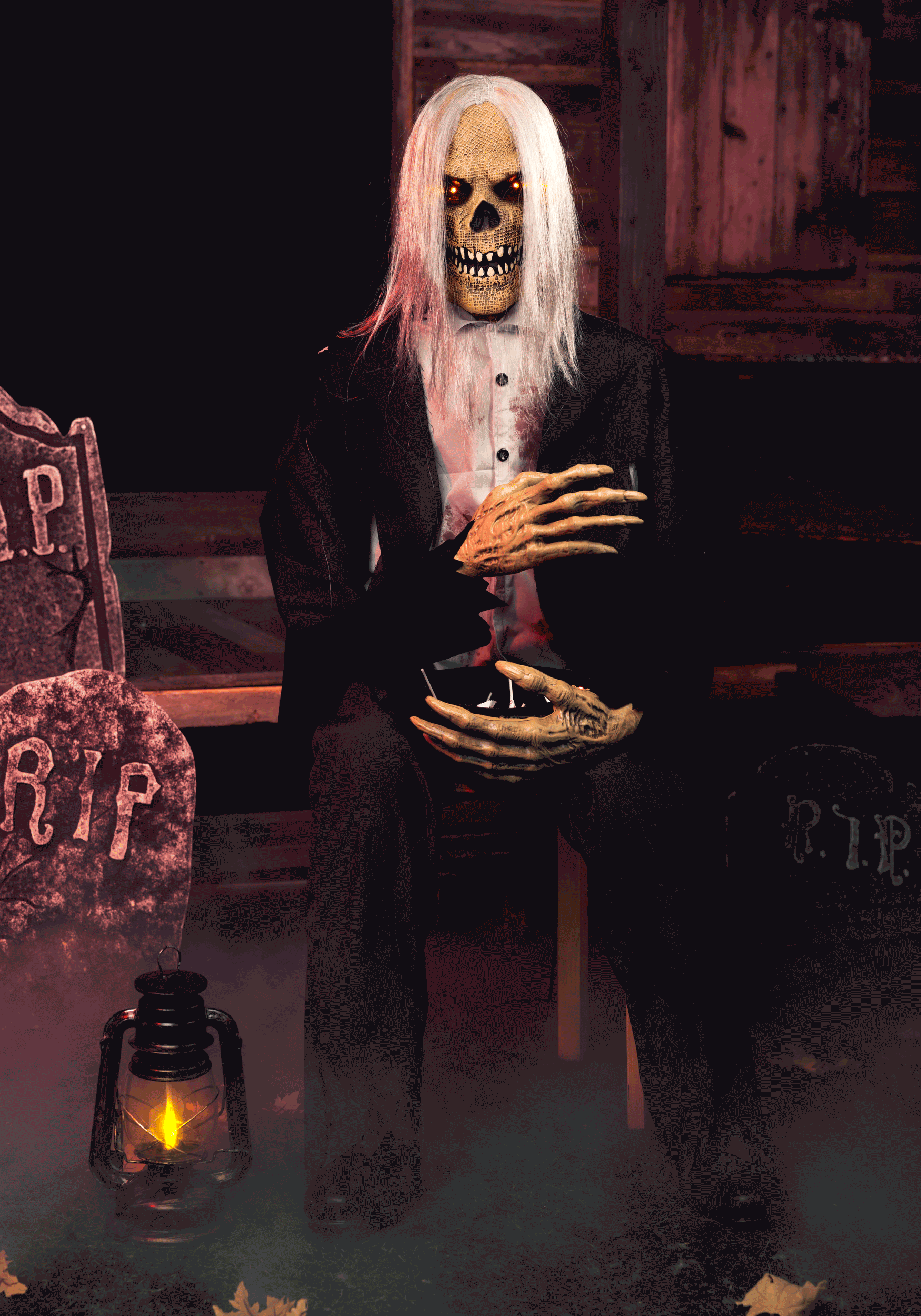 Gutfried arrives as a fully assembled 58-inch seated figure constructed from metal, plastic, and polyester fabric clothing. Long ratty hair drapes over his skeletal face, and weathered clothing completes the look of someone who's had a rough century or two. His right arm swipes outward while he clutches a candy bowl that lights up red along with his eyes, creating an eerie glow that's visible from the street.