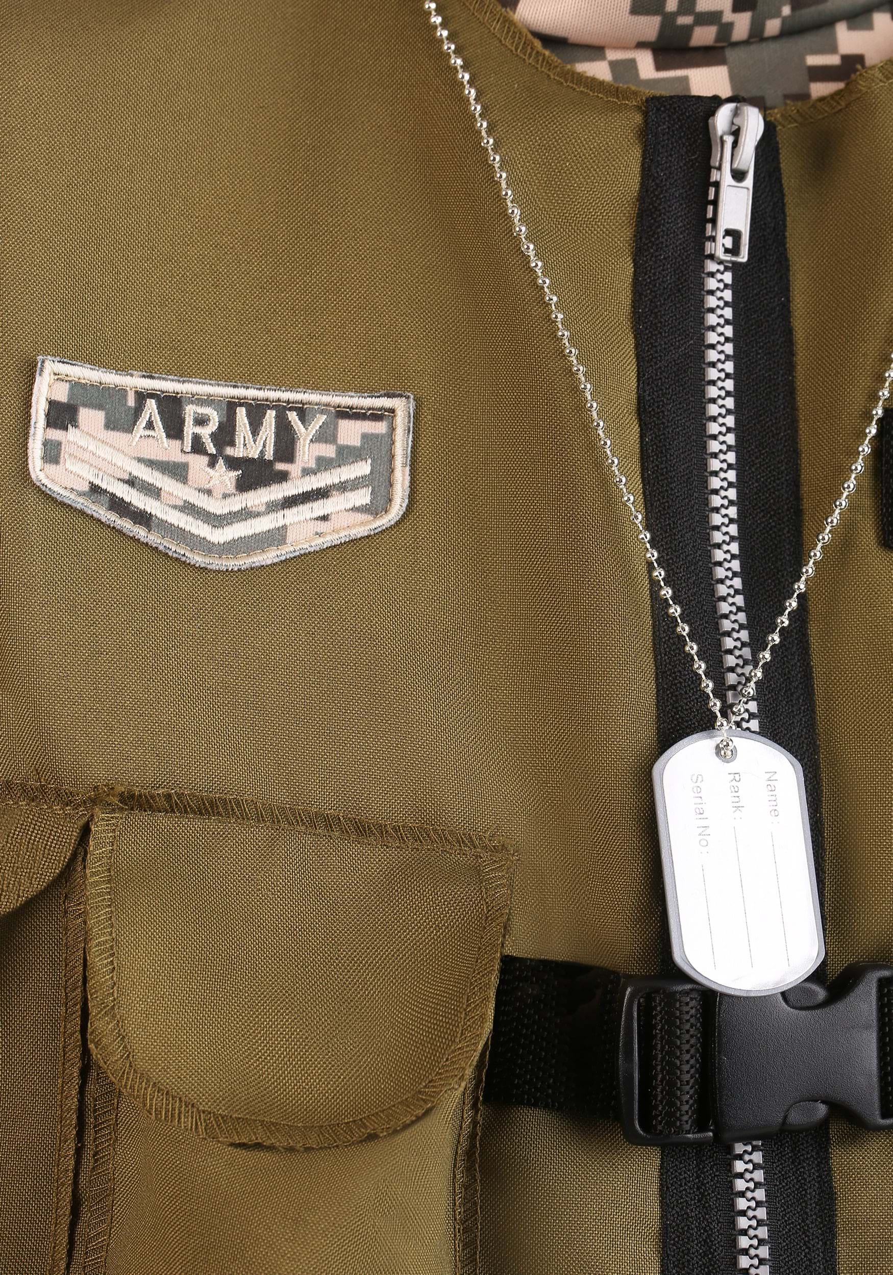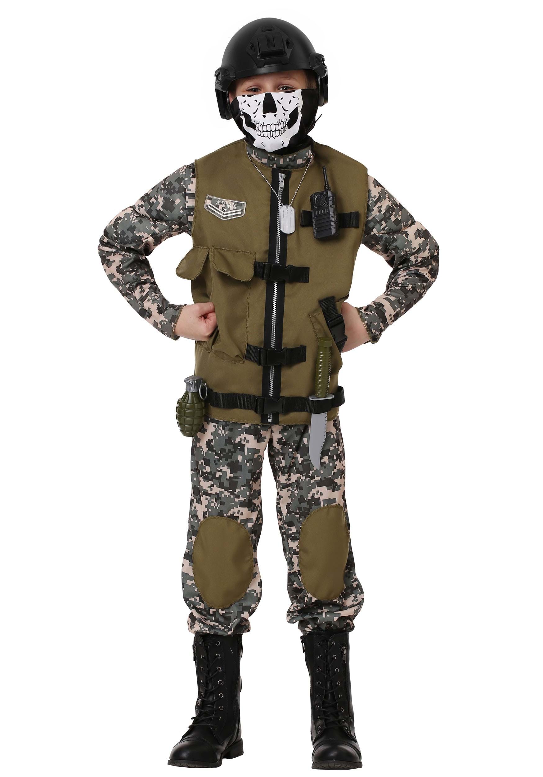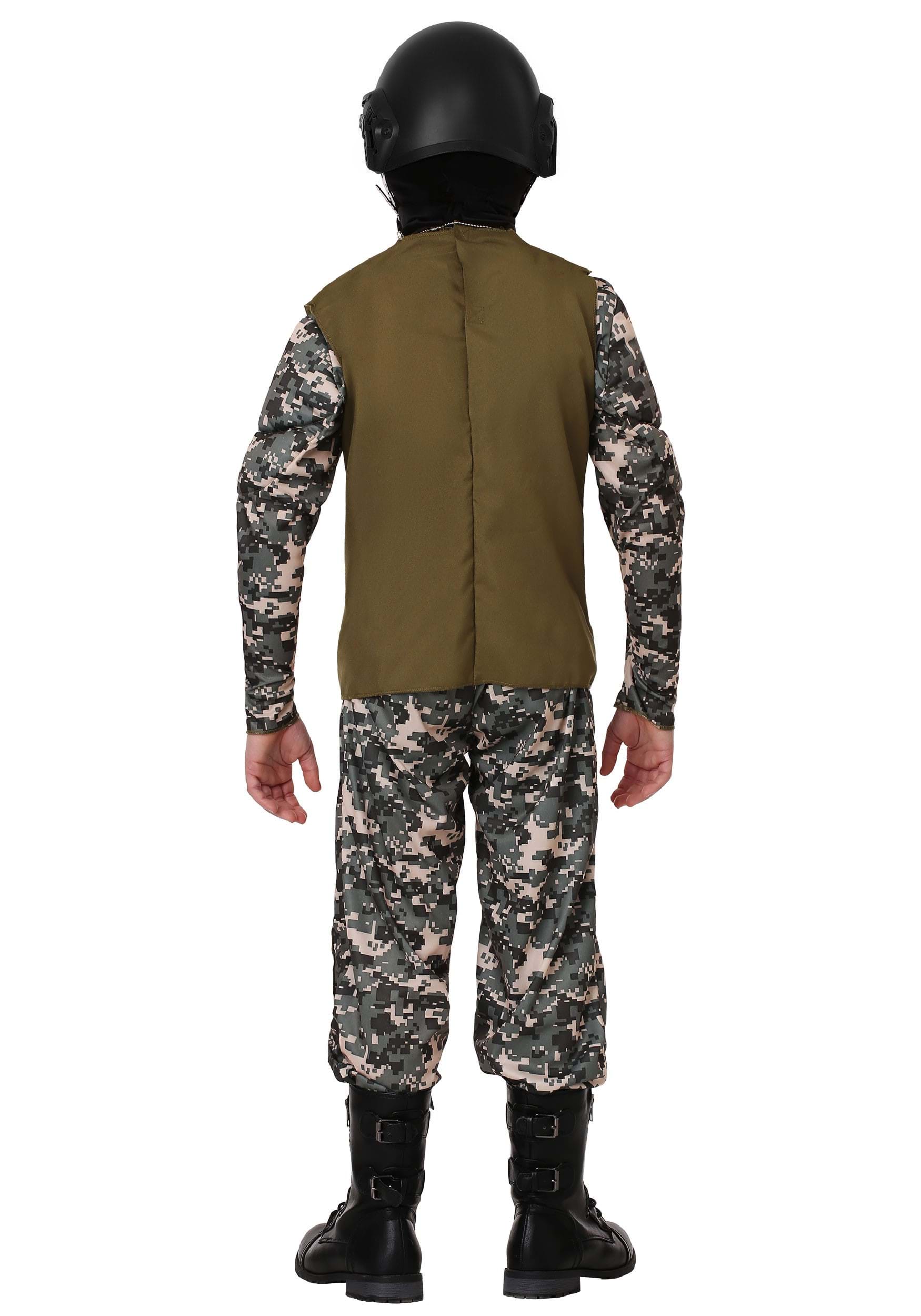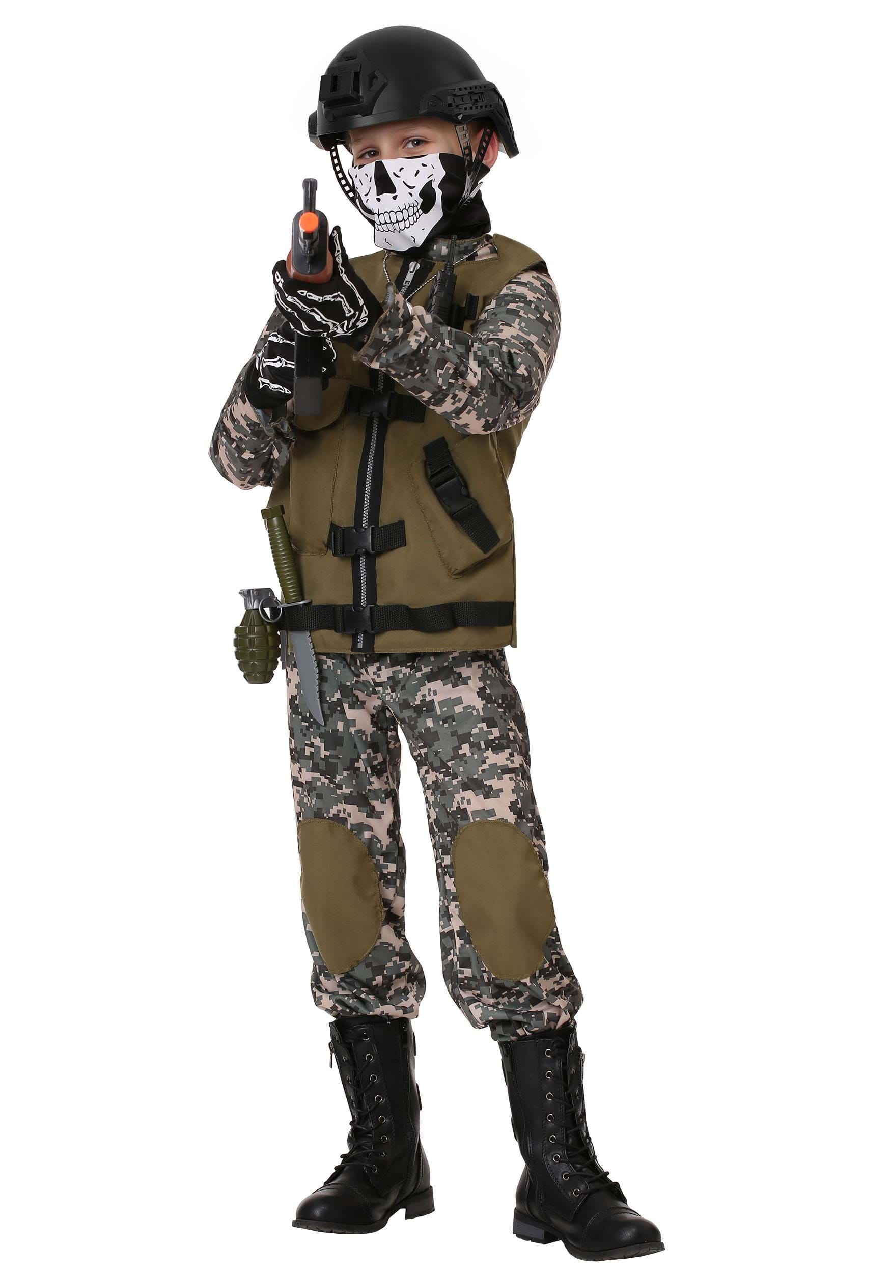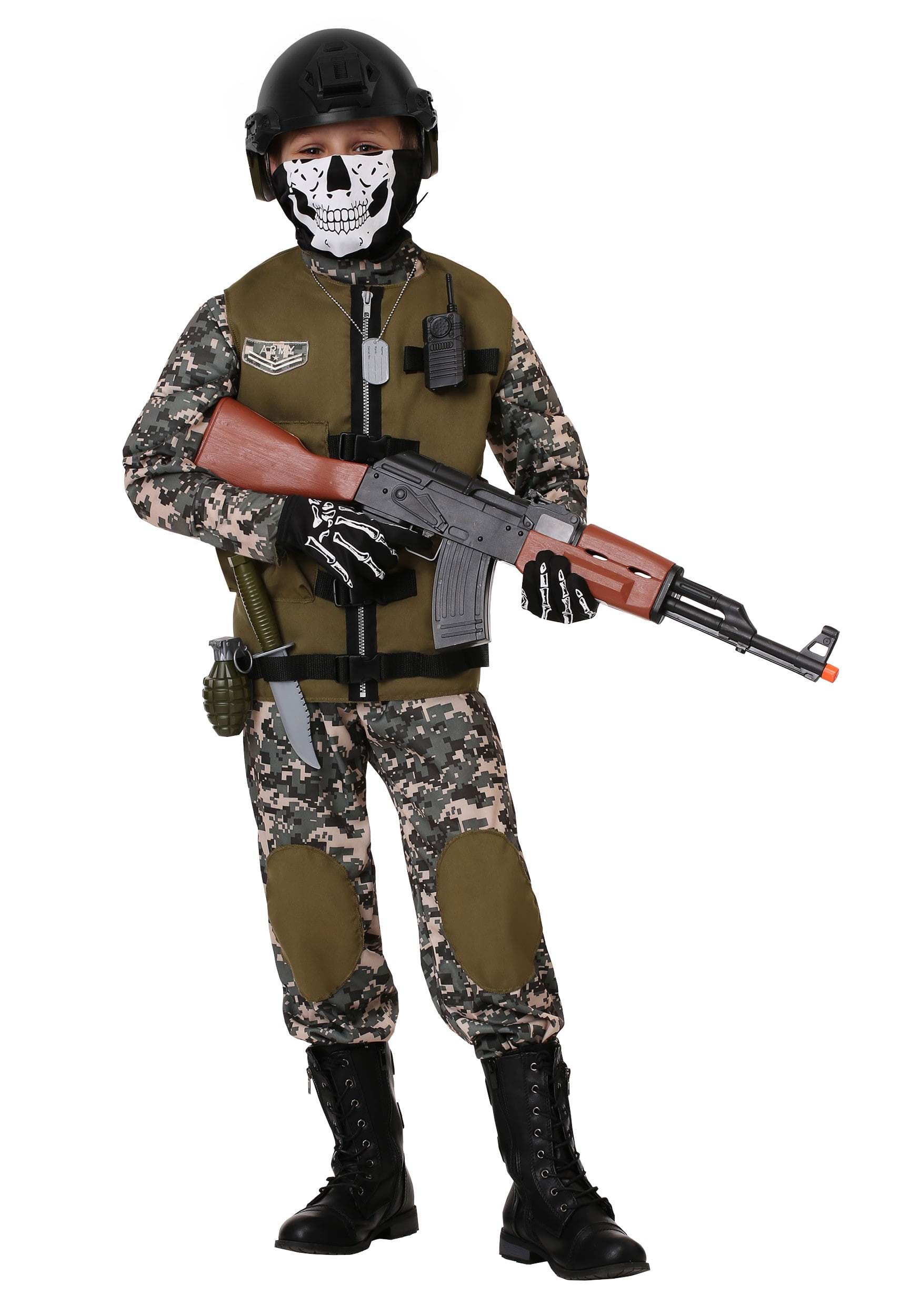 You can be certain that your kiddo will succeed in gathering up all the choice candy and avoiding harm from demon, devil, and Disney princess thanks to our hard-working designers who have created this exclusive Kid's Camo Trooper Costume. The shirt and pants feature a camouflage look to bolster their wilderness stealth while the vest features fiberfill padding to bulk up those chest and shoulder muscles. (Plus, the cargo pockets for extra candy storage is always a bonus!) The molded helmet gives a dose of security while the skeleton-print mask and gloves channel a bit of terror and even additional camouflage while they're walking with the undead! If all else fails, the toy grenade and knife can defend your tyke and they can cheer their victory with the walkie-talkie upon securing those tasty treats!