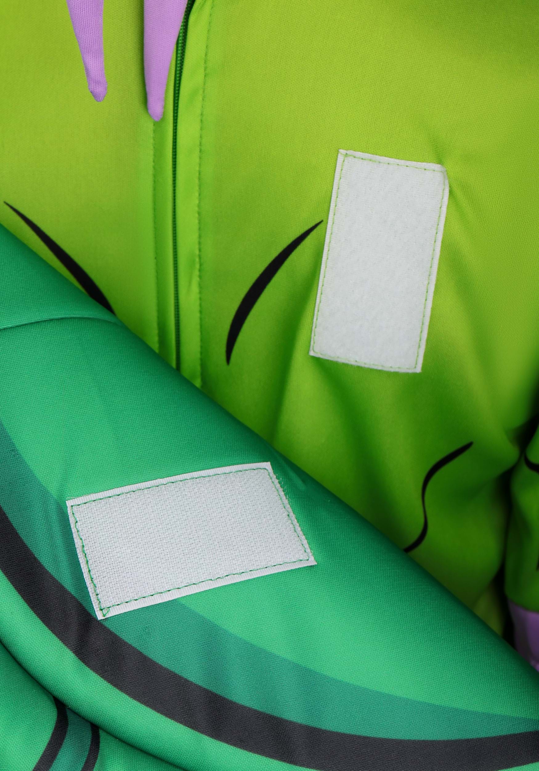 - Foam and sublimated, jersey knit shell has opening to add stuffing as desired, hook and loop fastener to secure on the back of the jumpsuit