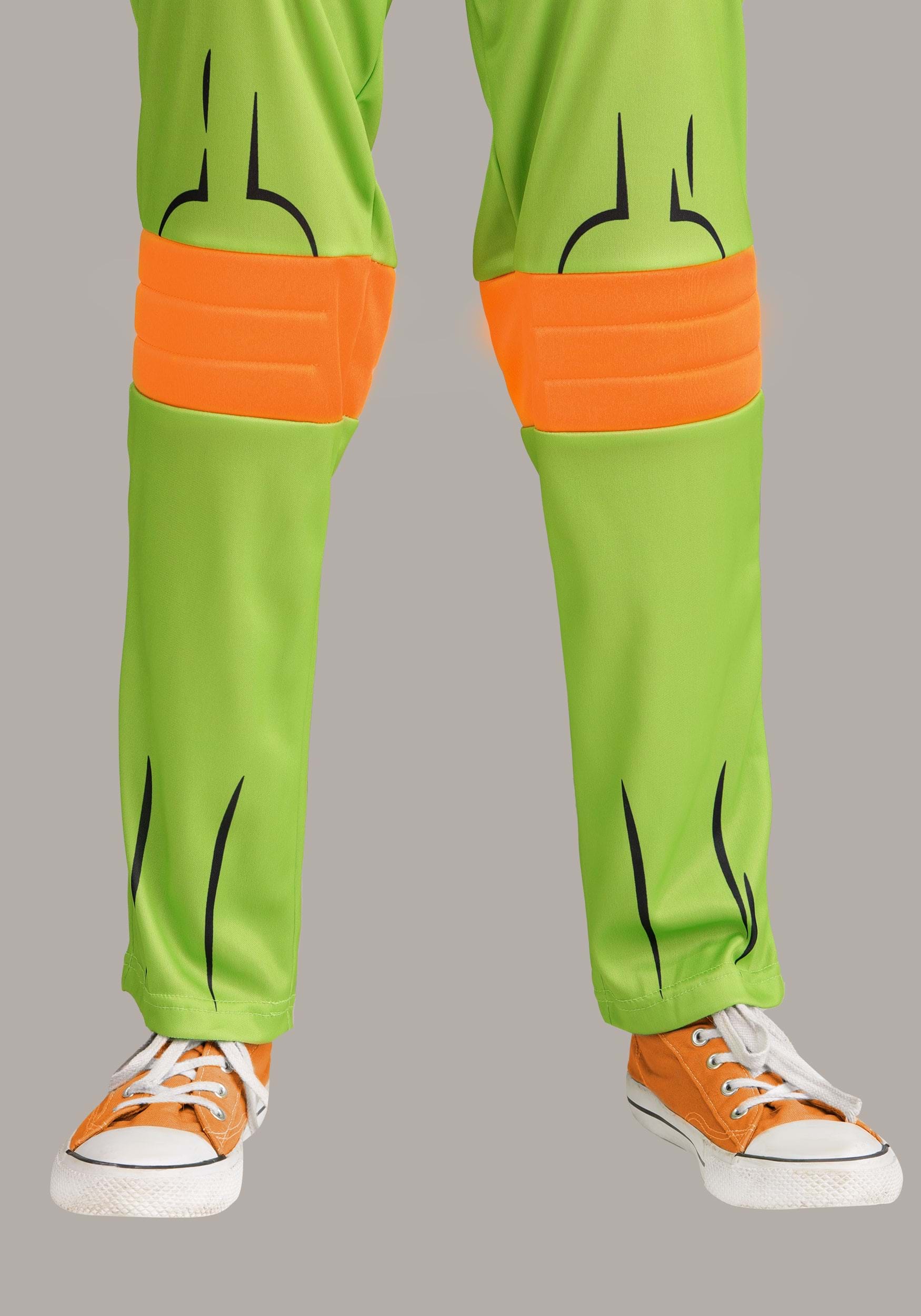 The costume comes with a full-length polyester jumpsuit that zips in the back for easy on and off (even during high-priority snack breaks). The front features printed details like a turtle shell, belt, and the iconic “M” badge, while orange jersey knit elbow pads, wrist wraps, and knee pads are built right into the design—so there’s no fiddling with extra pieces.