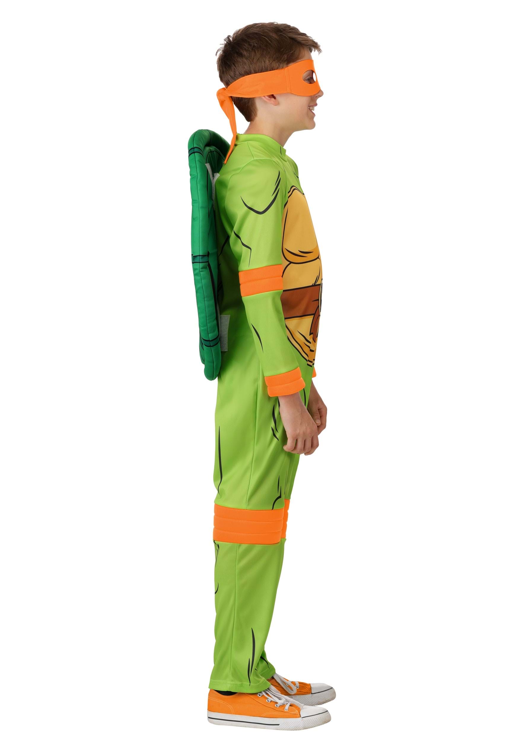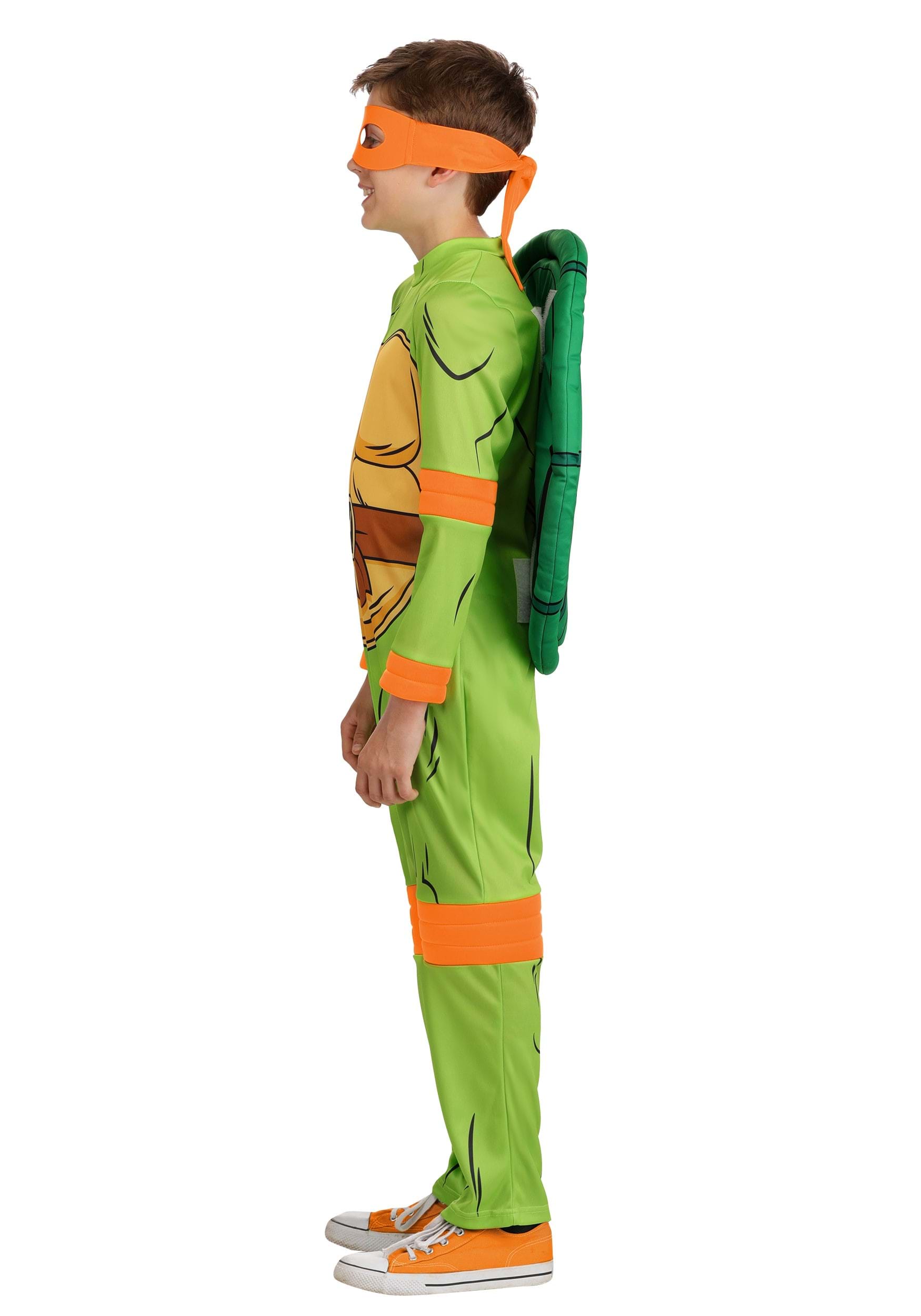 An attached matte jersey turtle shell secures to the back with hook-and-loop fasteners, and the foam-backed orange mask completes the look with that unmistakable Michelangelo flair. It’s made for comfort and movement, so your kid can go full ninja mode in the living room or at the costume party.