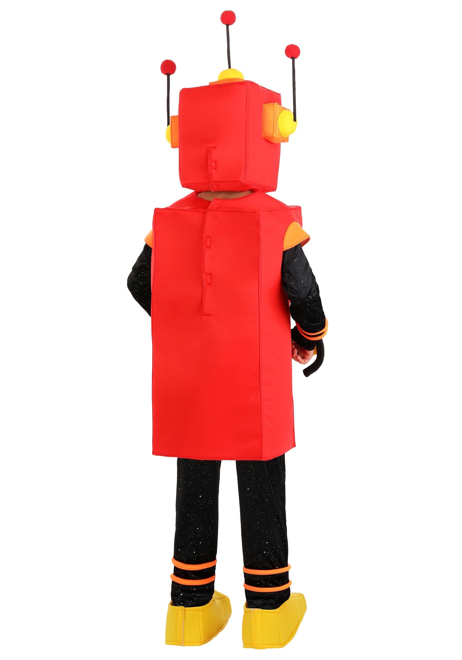 This costume includes a bright red foam tunic with printed details that mimic control panels, knobs, and gears—it’s giving vintage toy robot vibes. The matching square headpiece features cute printed eyes and antennae topped with soft red spheres. The black long-sleeve jumpsuit slips underneath to cover arms and legs, trimmed with orange and yellow accents that give the look even more dimension.