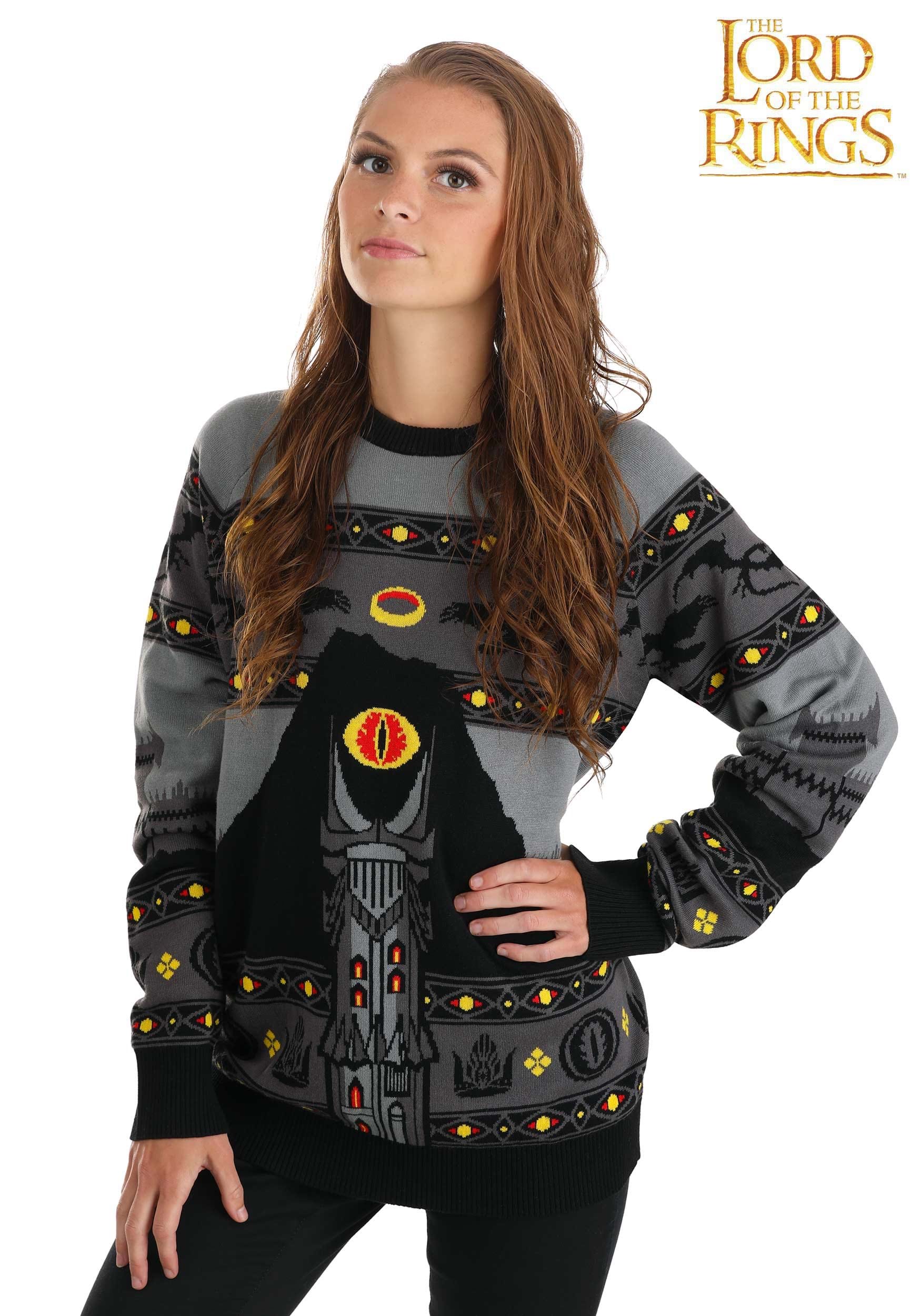 Ready to visit Mordor? Well, there are plenty of sites to see there! There is a large community of unfriendly orcs, piles of ash and dust, and the Eye of Sauron, which sees all and glares upon all who would step foot into the forsaken land. Actually... we're with Boromir. It's probably not a good idea to casually walk through the most terrifying location in Middle-earth. Maybe it's just better if you bring a little piece of Mordor with you wherever you go. This Mordor Lord of the Rings Ugly Sweater helps you do just that!