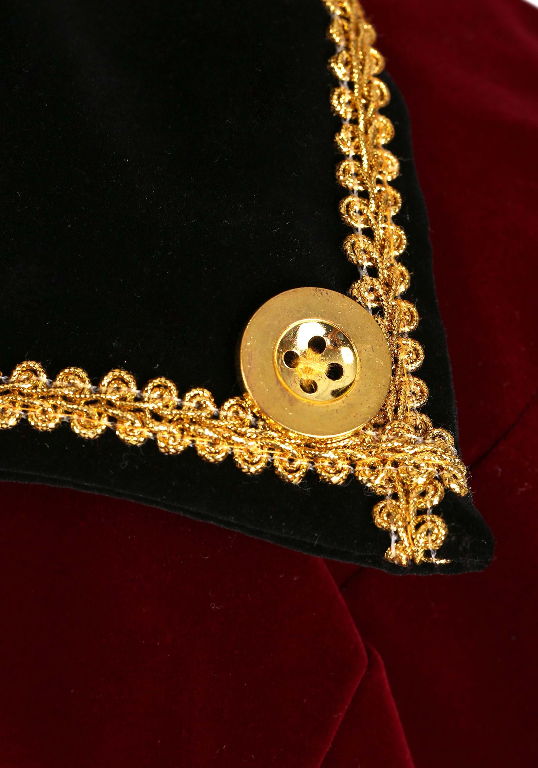 - Maroon velvet jacket has black velvet collar, lapels, sleeve cuffs, and false pocket flaps