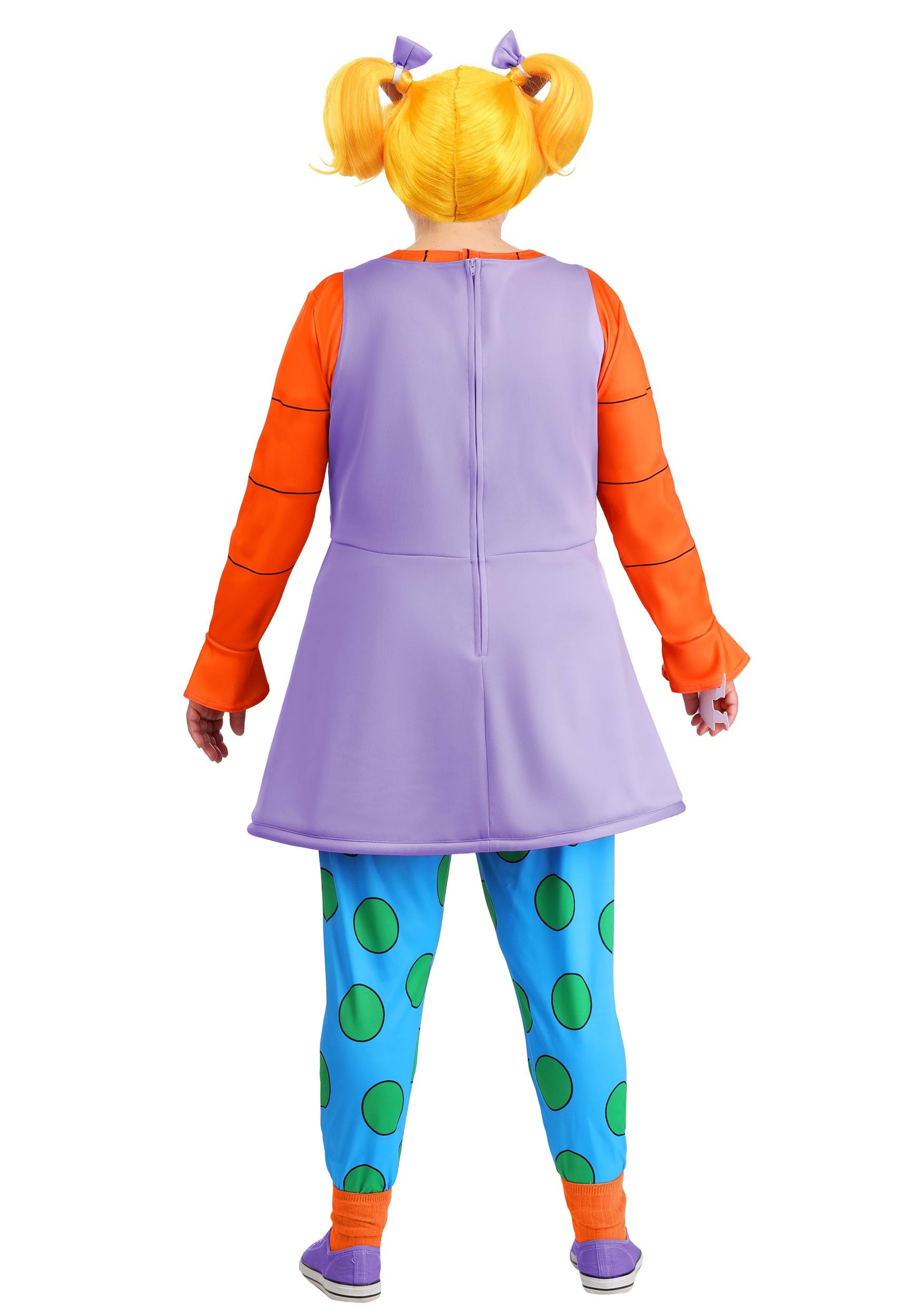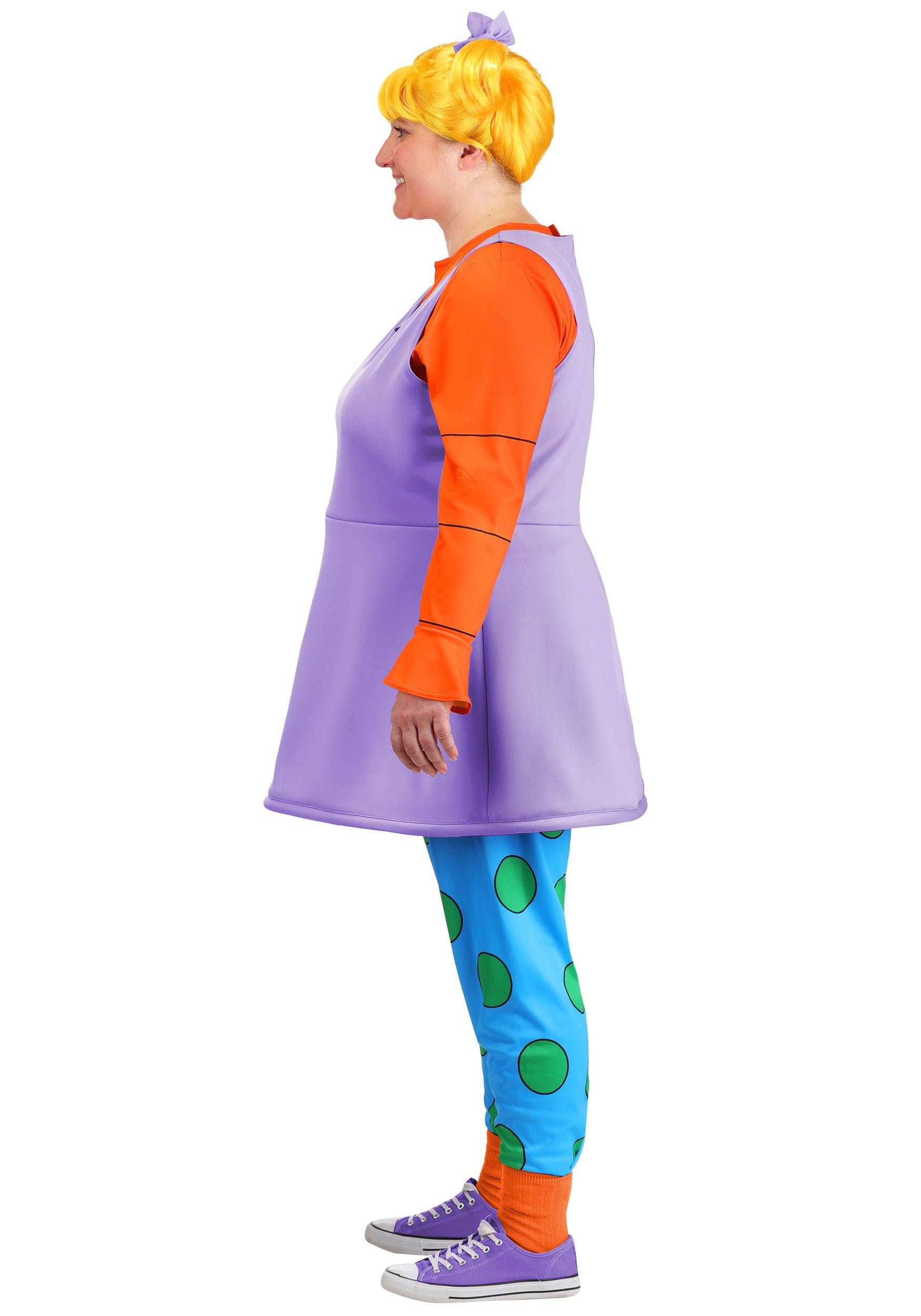 The costume starts with a long orange sleeve shirt attached to a swingy purple dress, capturing Angelica’s layered look from the cartoon. The leggings are printed with giant green polka dots on bright blue fabric, with an elastic waistband for comfort and mobility (crucial for dramatic flops onto the couch). Orange socks are included for full-color accuracy from head to toe.