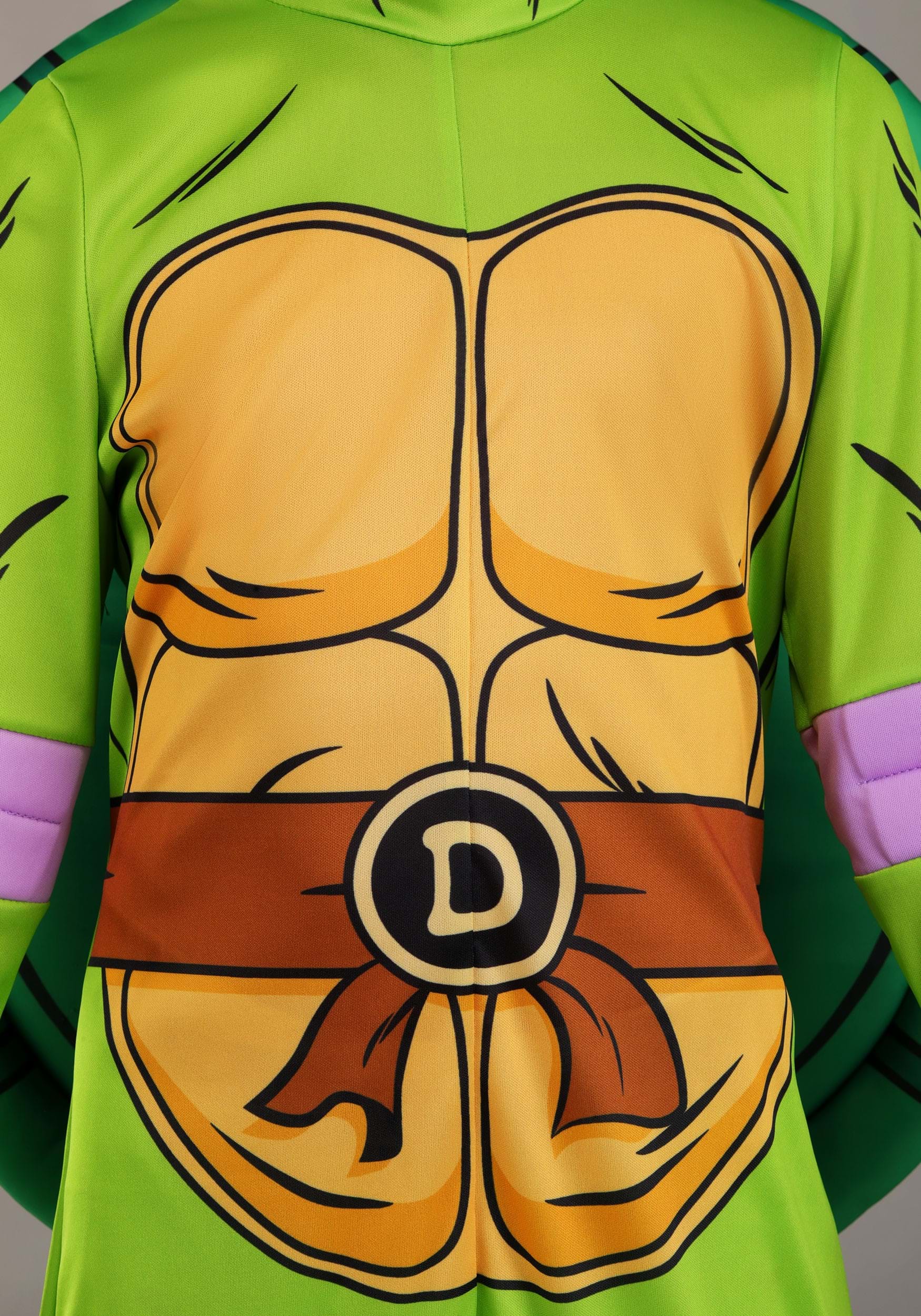 The front of the jumpsuit features a printed chest shell, a built-in belt design, and of course, Donatello’s “D” emblem in the center. The purple eye mask is backed with foam for a soft fit and serious Turtle style. This version of the costume is designed to accommodate different body types, so fans of all shapes can join the sewer squad without fuss.
