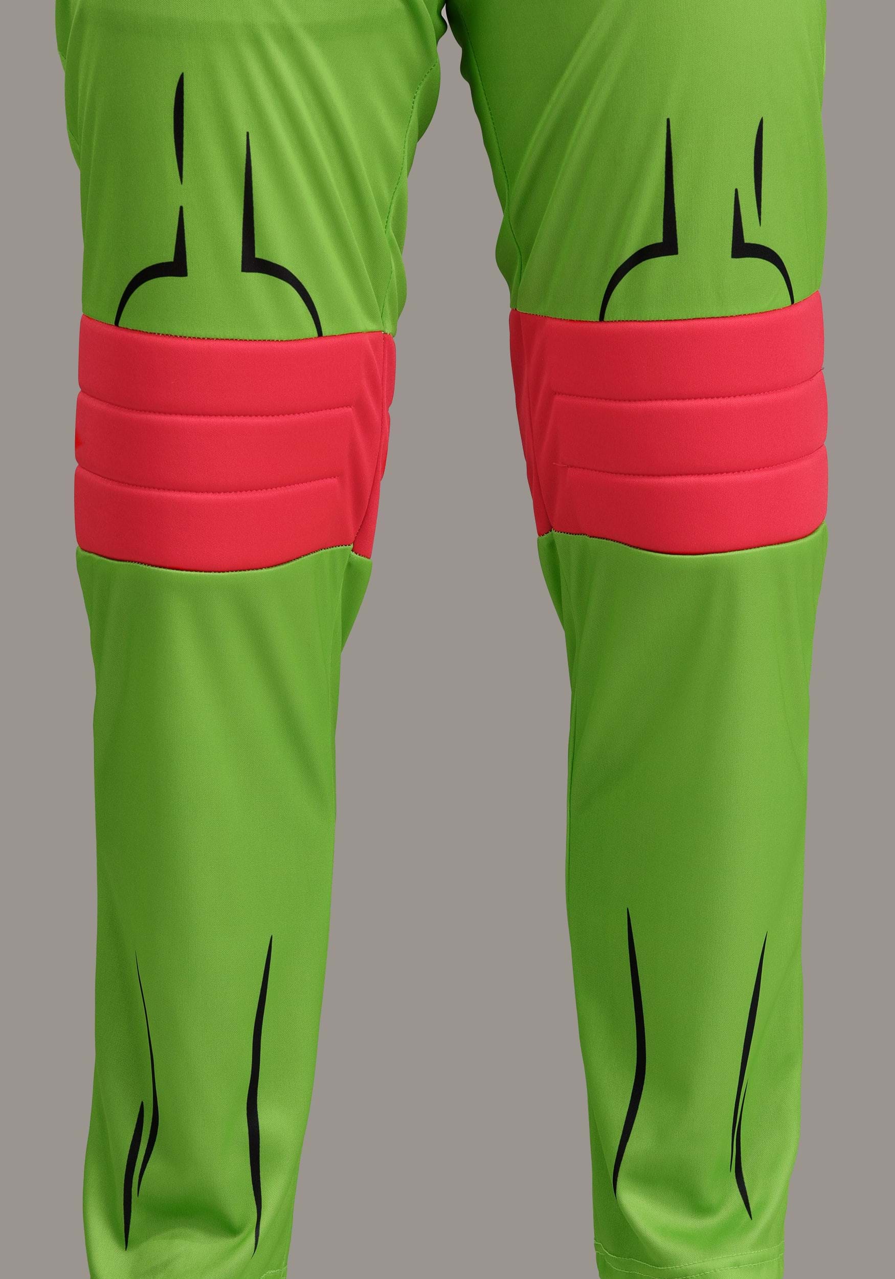 The jumpsuit itself zips up the back and features a printed front shell with sculpted abs, a brown belt with Raph’s “R” emblem, and red accents on the elbows, wrists, and knees. Made from polyester fabric, the suit’s got a classic comic-book look with printed linework that brings Raphael’s animated style to life.