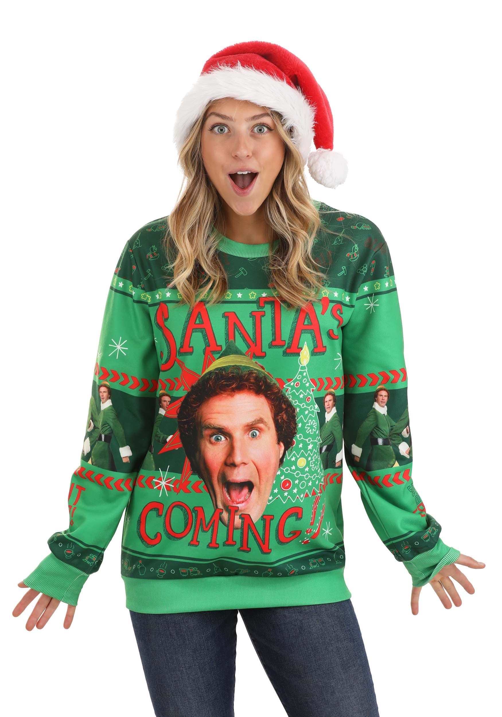 Our Adult Santa's Coming Elf Ugly Sweater is the perfect way to celebrate holiday cheer and one of your favorite flicks. Designed by our own team of costume and apparel crafters, it captures that iconic movie moment and has sincere ugly sweater styling so you can sport a signature ugly look for all of your favorite holiday moments.