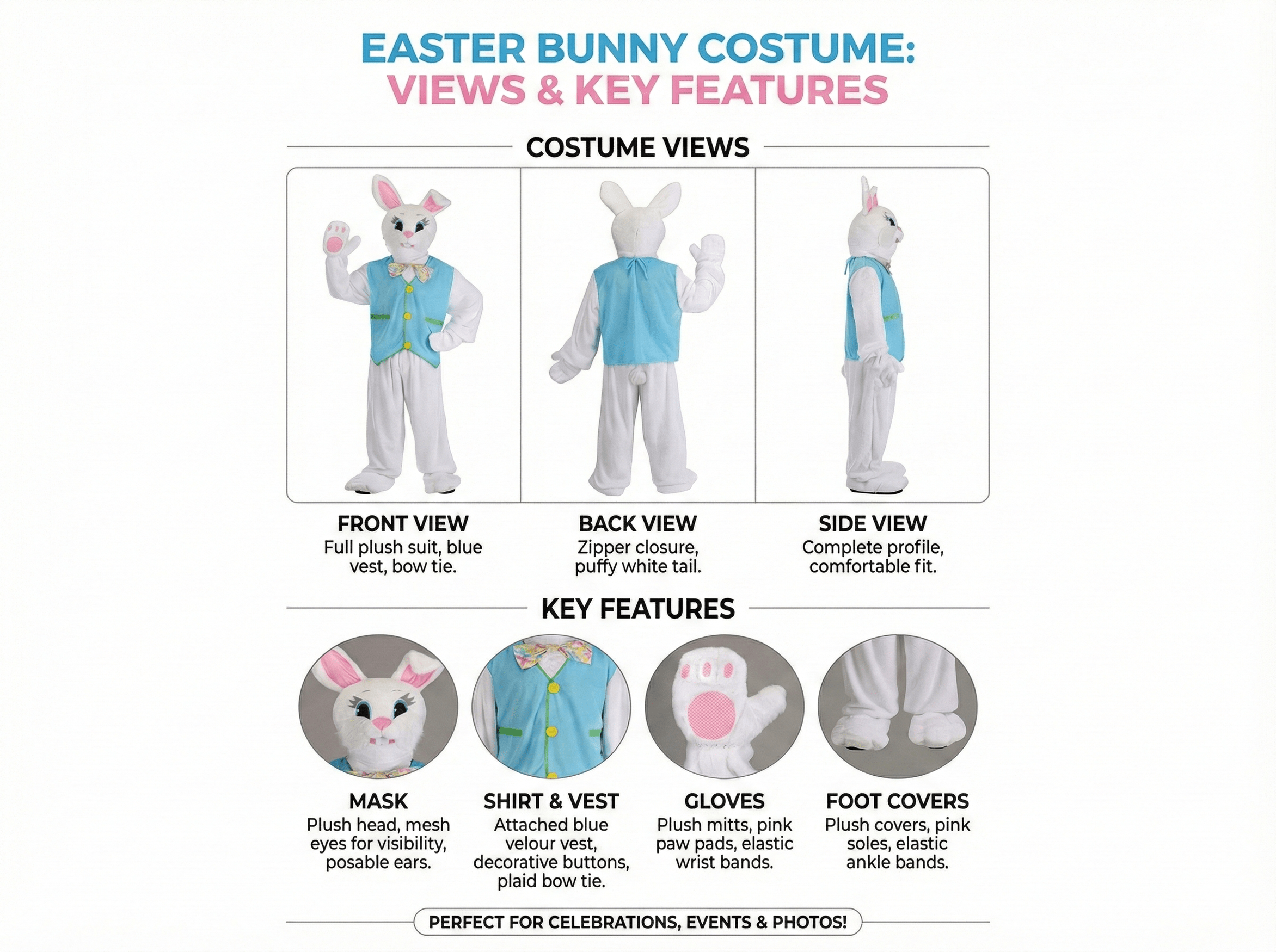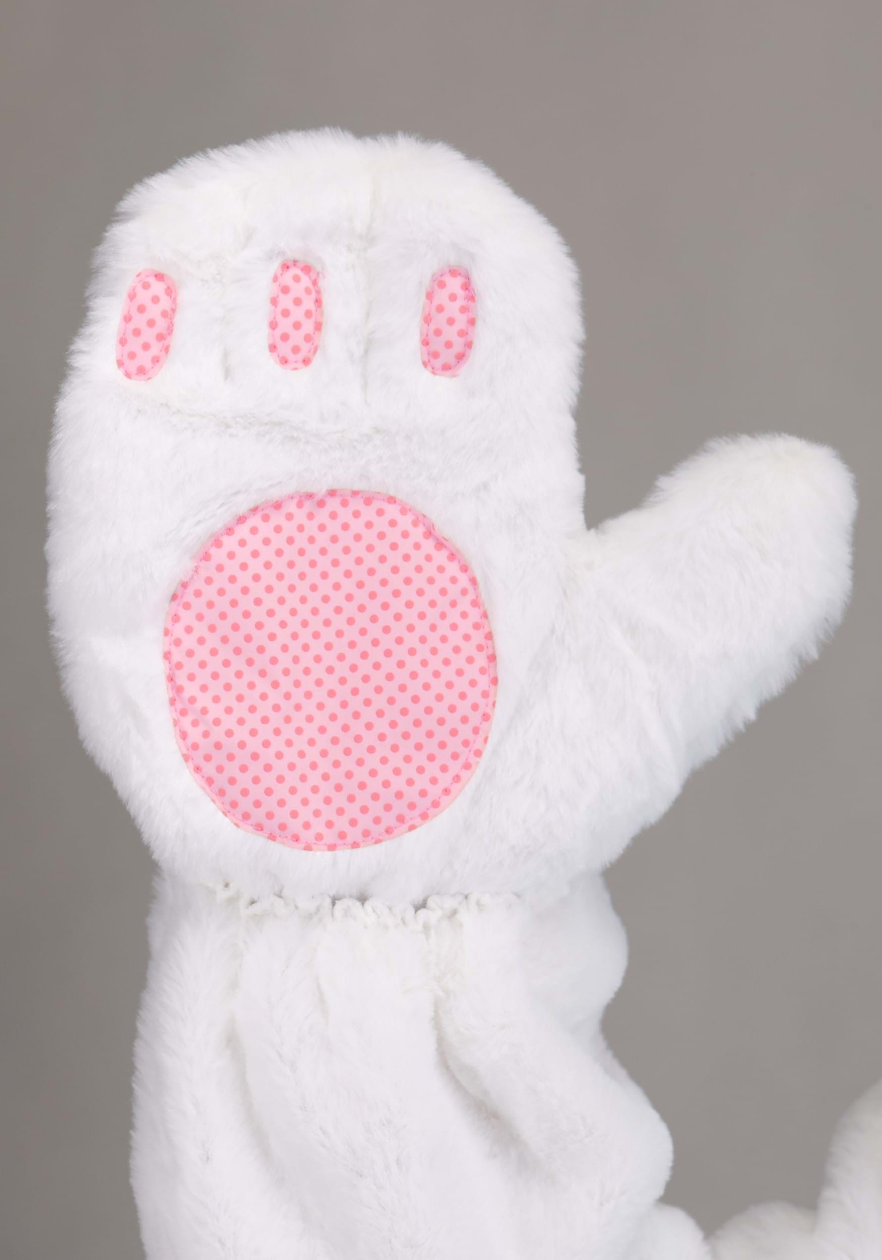 The bunny headpiece is where the real magic happens. It has mesh eyes for visibility, felt and embroidered facial features, and posable ears with satin inners, so you can adjust them to match your energy—perky and alert, or slightly floppy after one too many jellybeans. The plush mitts secure with elastic bands, keeping your paws in place, and the plush shoe covers have pink bottoms and elastic at the ankles, so you can transform any footwear into bunny feet.
