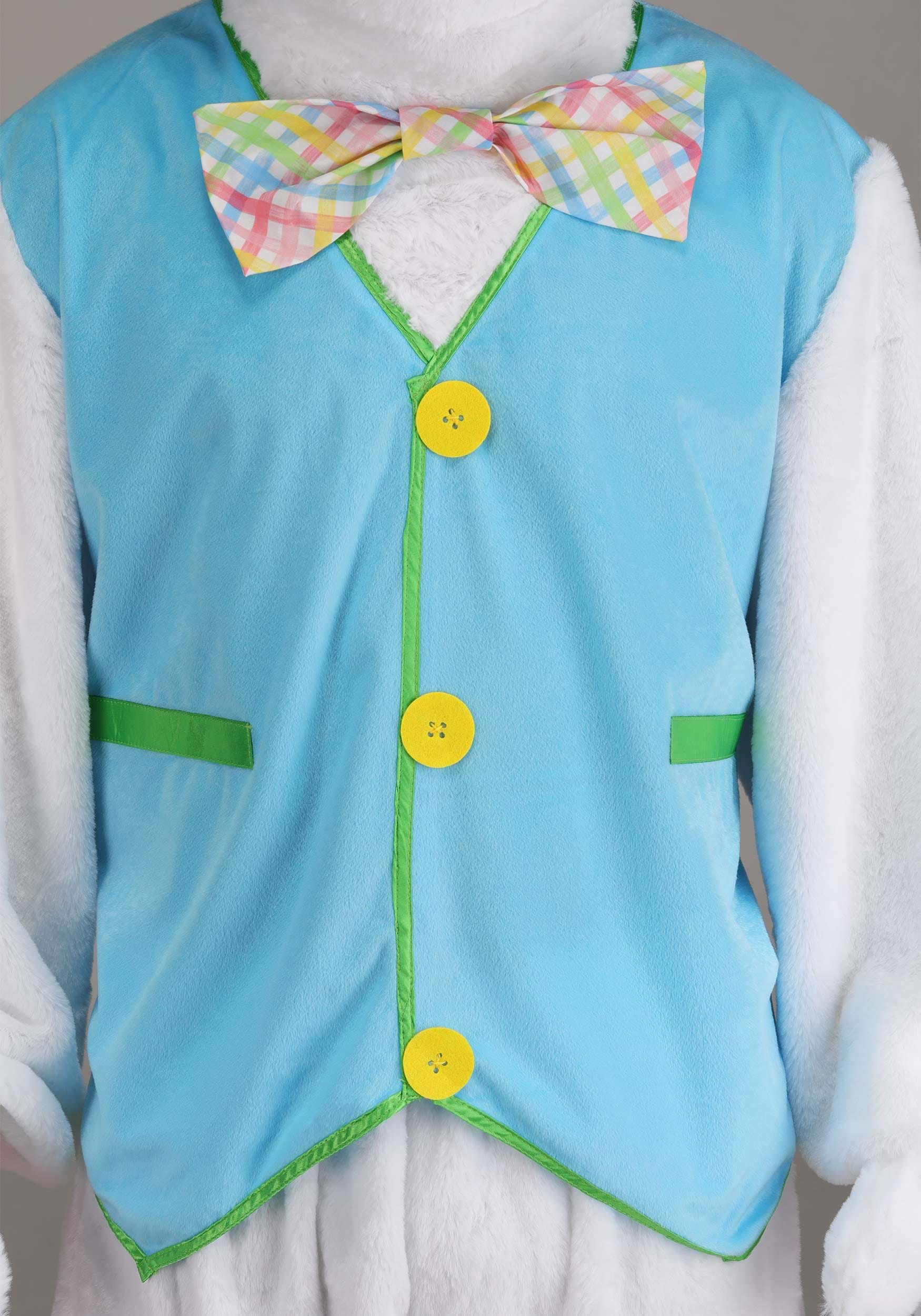 This costume includes everything you need to fully embrace your new bunny identity: a plush shirt, pants, headpiece, mitts, and shoe covers. The plush shirt features a velour blue vest, decorative buttons, and satin lapels—because even an egg-delivering rabbit needs a little formalwear. A sewn-on bow tie completes the look, letting everyone know that you’re here for serious bunny business. The plush pants have an elastic waistband and ankle cuffs, perfect hopping from one Easter event to the next.