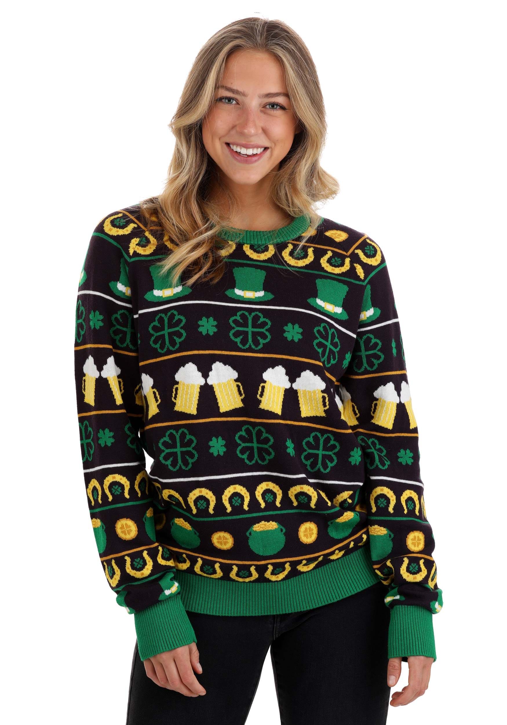 - Sweater has images of top hats, mugs, horseshoes and shamrocks