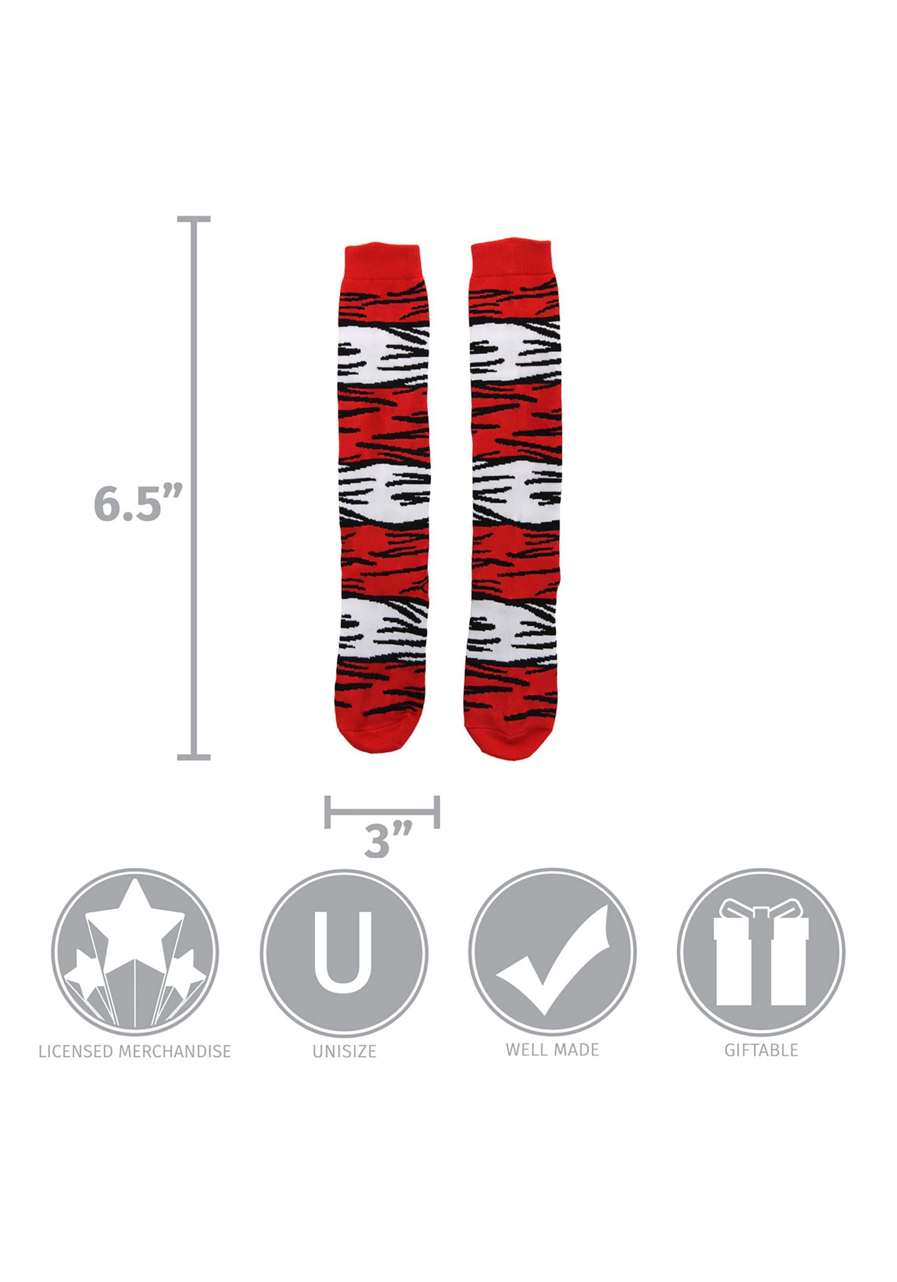 These could just be plain red and white striped socks, and we could call them Cat in the Hat socks. But why not take things a step further? These knee-high kid socks also feature black lines that represent the rumples and wrinkles that are so present in the original book's art style. It's a sweet detail that makes these socks definite Dr. Seuss socks and not something else. Looking for more Dr. Seuss costume items? Check out our website! We've got Cat in the Hat hats, Things One and Two accessories, and much more!
