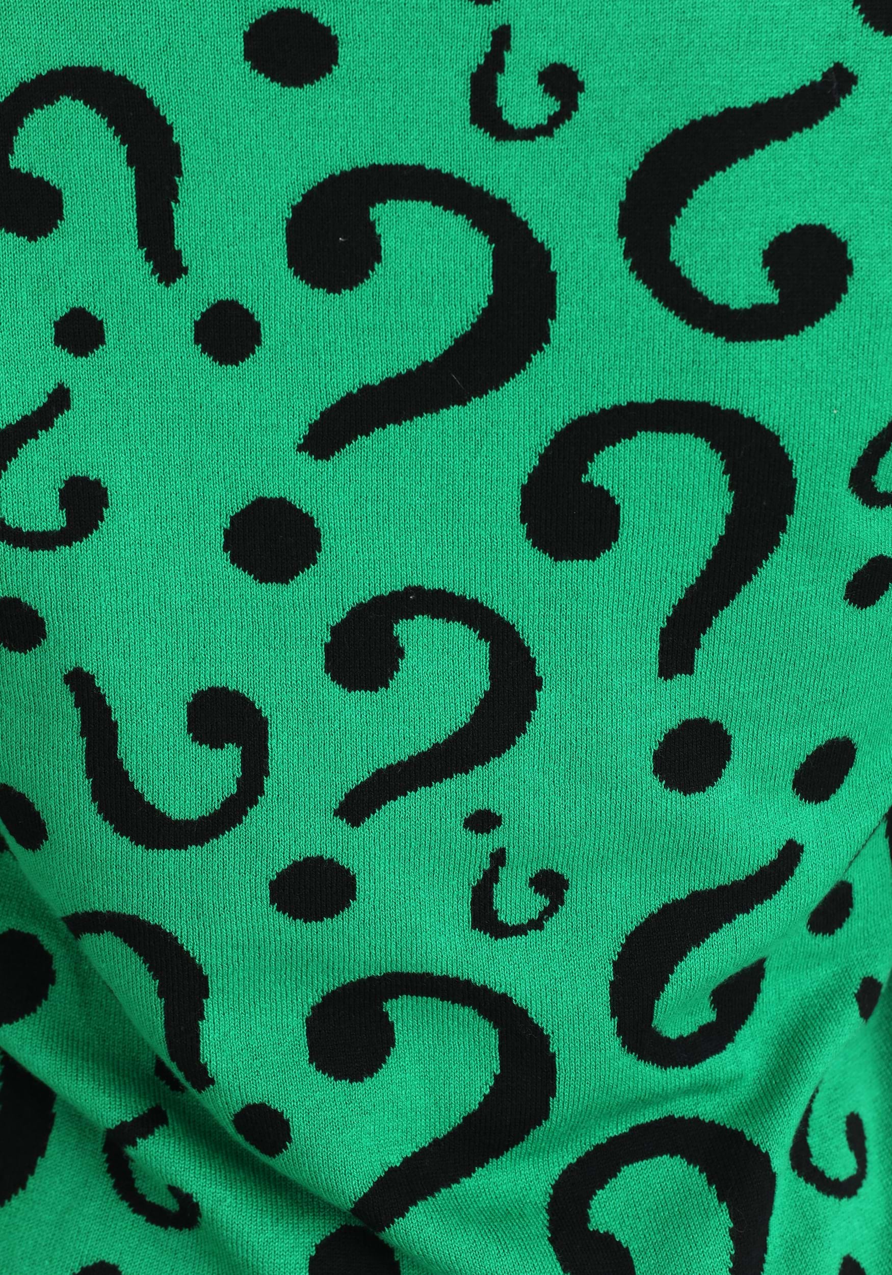 That's because you've got this Riddler Christmas Sweater. It's time to elevate Gotham's dreary style to your genius level and there's no better way than with the brilliant combination of the Riddler's favorite colors. This knit sweater features a field of green with dozens of black question markers all over the place! Rib-knit cuffs, waistline, and a black collar keep this sweater fitting great while the startling color combo will be great for the Holiday Season or even to inspire folks with the enigmatic villain that has Gotham citizens holding their heads!