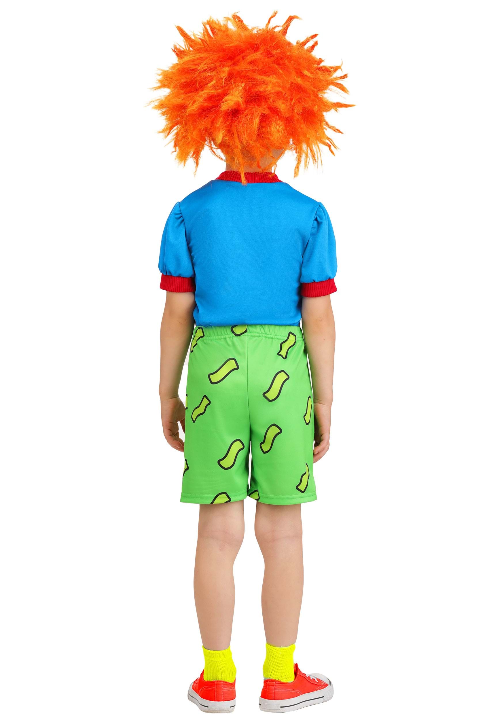 The costume comes with four essential pieces that recreate Chuckie's classic look. The short-sleeved shirt is made of soft blue fabric with red rib knit bands at the sleeves and neck, and a printed yellow-and-red planet right on the front—because even Chuckie dreams big. The green shorts have an elastic waistband for easy changing and are printed with squiggly yellow shapes that match his TV style exactly.