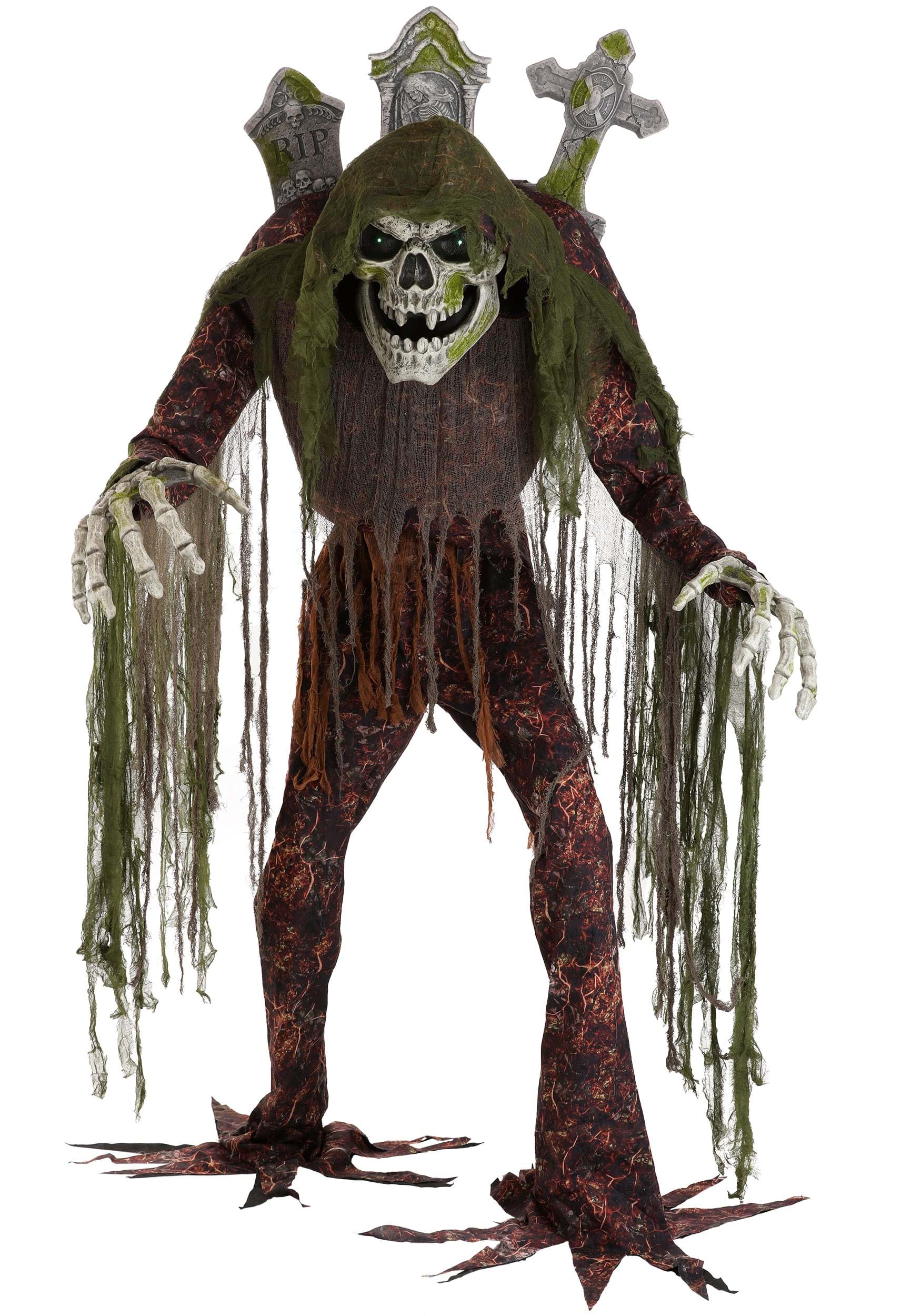 - LED green eyes, tombstones sprouting from his back, moss like robes