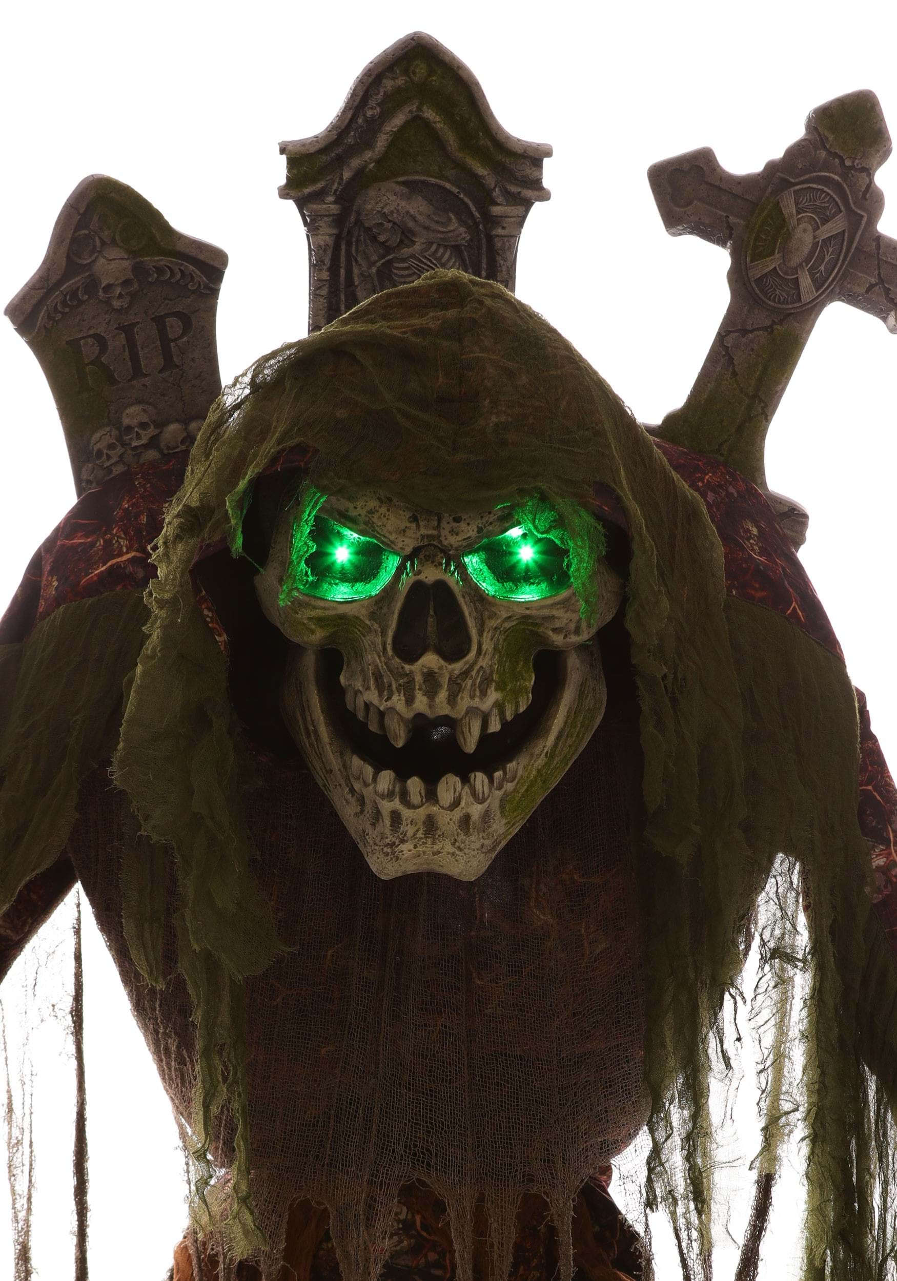 His robes are made from layered polyester fabric with moss-like texture, draped over a plastic body and reinforced metal frame. Tombstones rise from his back, adding dramatic dimension to his silhouette. For covered outdoor or indoor use only. Must be plugged into a GFCI outlet when used outdoors. Measures 7 feet tall and 4 feet 2 inches wide.