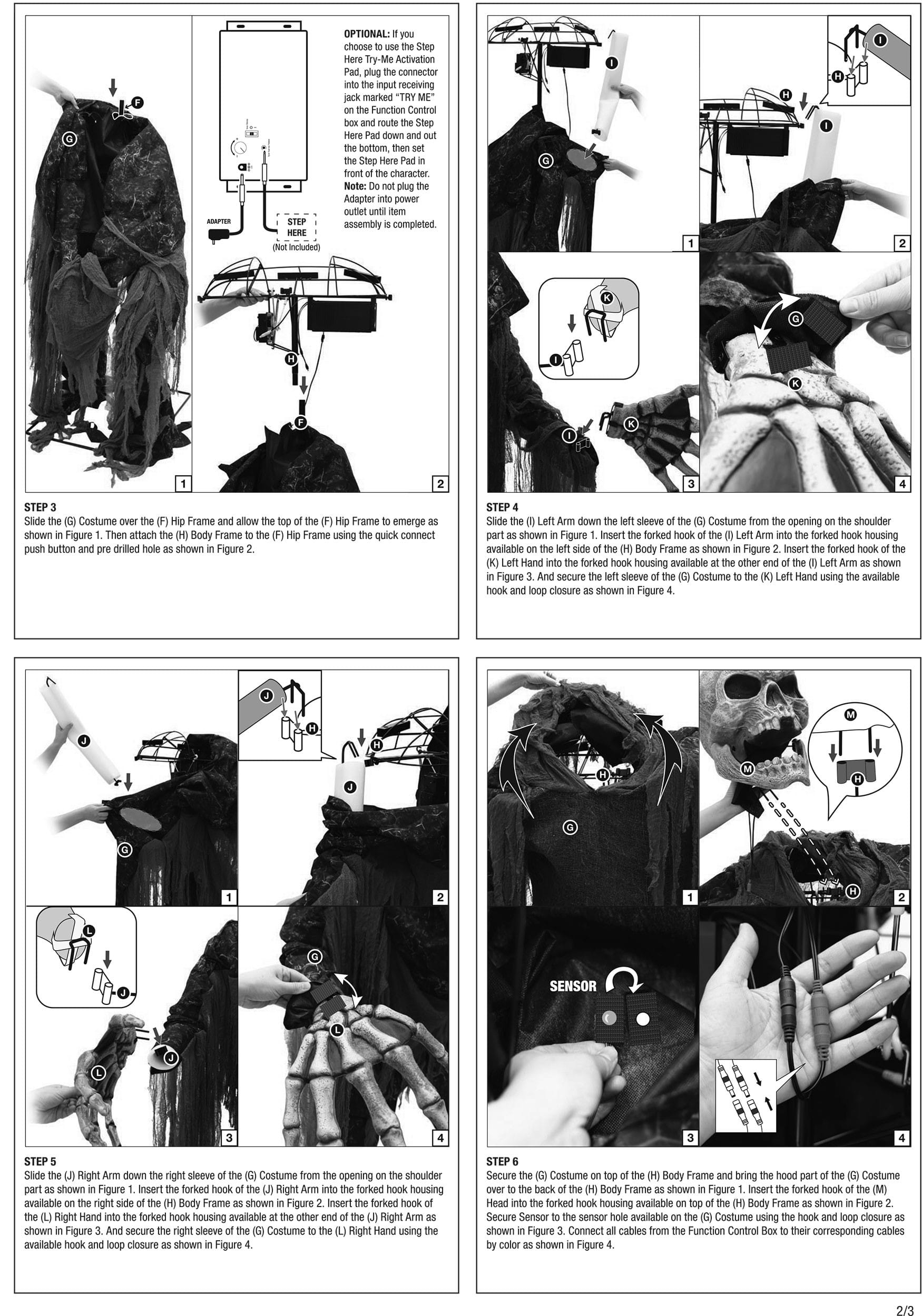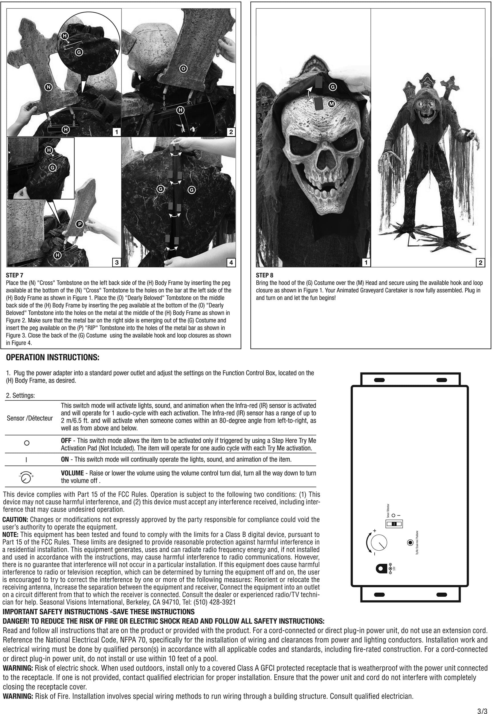 Tony Tombstone comes with a metal stand, animatronic body, power cord, and assembly instructions. The setup takes about 15–20 minutes. Once activated, Tony’s jaw moves, his right arm lifts, and his LED green eyes glow as he speaks and laughs. He’s motion sensor–activated and compatible with a step pad (sold separately), with on/off and “try me” modes plus built-in volume control.