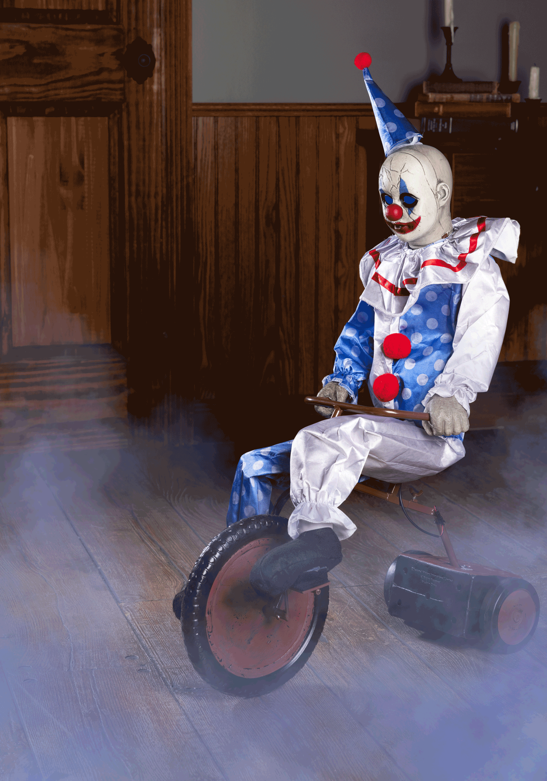 Sitting 3 feet tall, this animatronic clown features a metal and plastic frame dressed in a polyester clown suit that's somehow both festive and frightening. As haunting music plays, the clown's legs pedal the tricycle forward and back, while his blue-lit eyes pierce through the fog. He's basically the world's least fun carnival ride brought to life.