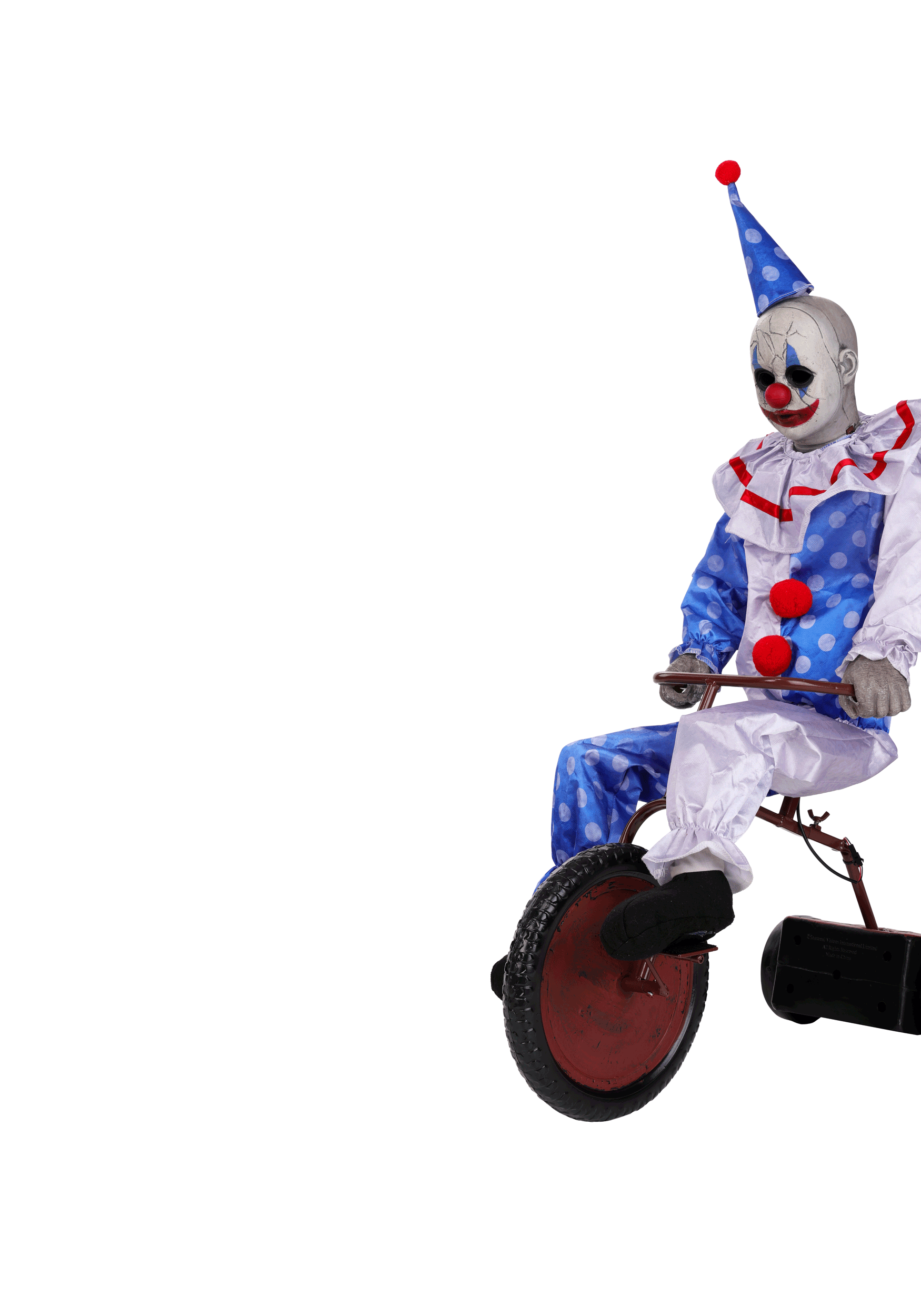 Nope, Nope, Nope! You know what's worse than a creepy clown? A creepy clown that can move. Meet the Tricycle Doll Clown Animatronic, proof that sometimes tiny things are way scarier than big ones. With glowing blue eyes and an unnerving little trike, this pint-sized terror pedals forward and backward like he's late for a haunted circus performance and you might need a ride to get there in time!