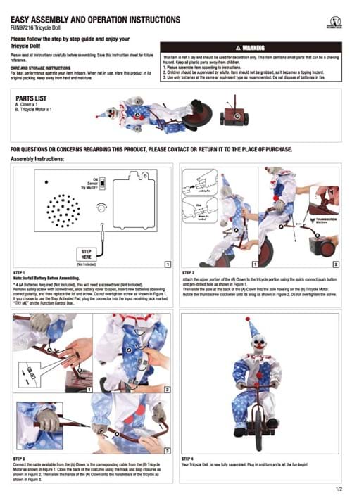 Powered by 4 AA batteries, this mini clown also has volume control, an on/off/try-me button, and motion sensor activation. Use it indoors or in a covered outdoor, dry space. Connect a step pad (sold separately) for even more control over when the ride of terror begins.