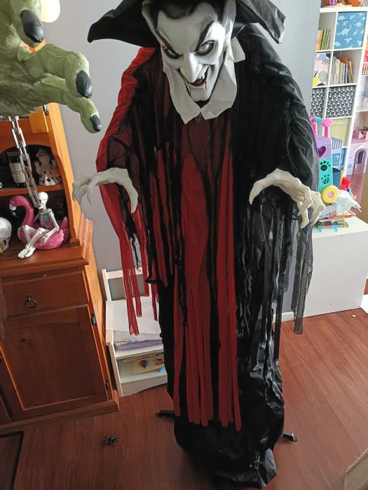 When activated, his red eyes begin to flash and the haunting audio kicks in. Bat screeches echo as he delivers four different lines in a richly exaggerated vampire voice, including, “I was hoping you’d come for dinner!” and the disturbingly enthusiastic “Children are wonderful for dinner!” The sound design mixes classic horror with just the right amount of wrong. His arms are posable, letting you adjust his posture from welcoming to full looming menace.