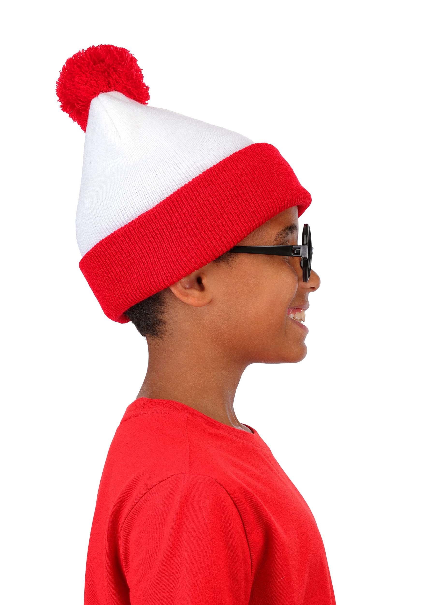 The knit cap brings the whole look together with classic Waldo confidence. It features a white knit body with a bold red trim and a fluffy red pom on top, because subtlety has never been part of the assignment. The knit fabric keeps it comfortable for long stretches of standing around being searched for.