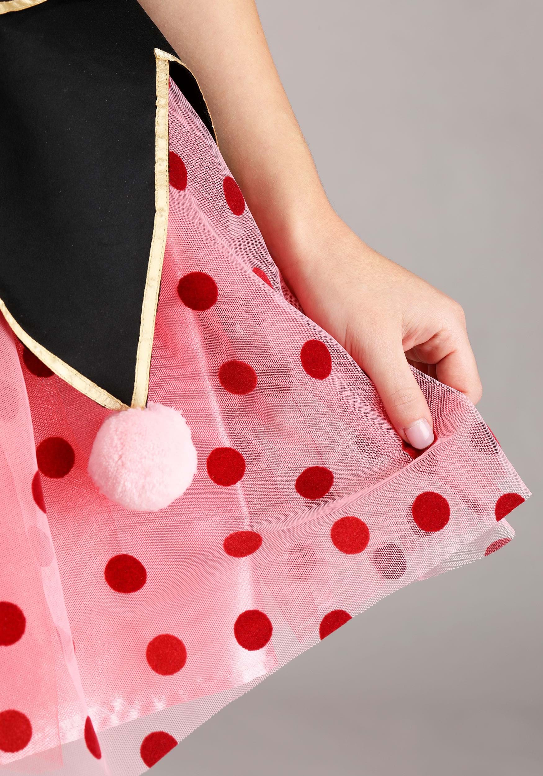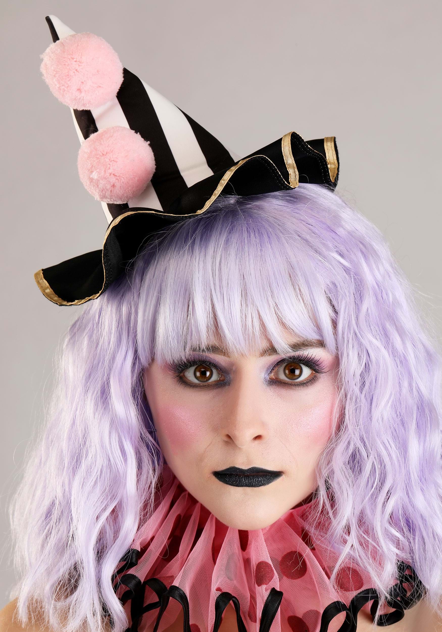 Elastic-edged arm bands with a black-and-white stripe pattern create the illusion of cold shoulders. The collar ruffle is made of the same tulle as the skirt and trimmed with black ribbon ties in place, and the costume is completed by a dainty clown hat. The hat has a black-and-white striped crown, pompoms on the front, and a scalloped brim, and can be secured with bobby pins threaded through attached elastic loops.