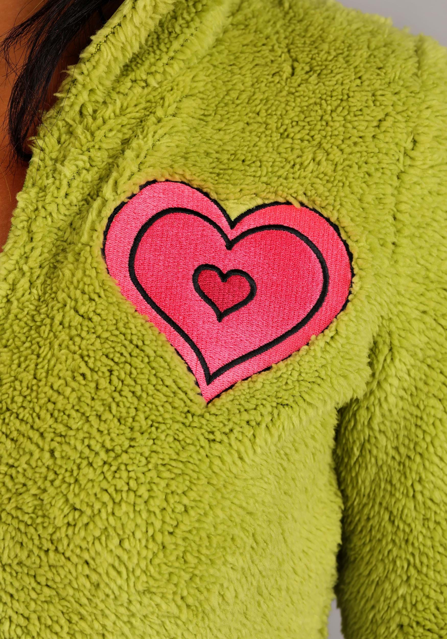 This officially licensed romper is made from soft, stretchy sherpa-style faux fur, giving you the full fuzzy Grinch look without committing to full villainy. It zips up the front for easy wear, and features an embroidered red heart on the chest—just in case yours happens to grow three sizes by morning. The attached hood is lined with poly knit for extra comfort and features embroidered facial details and a tuft of faux hair, so you're unmistakably Seuss-y from every angle.