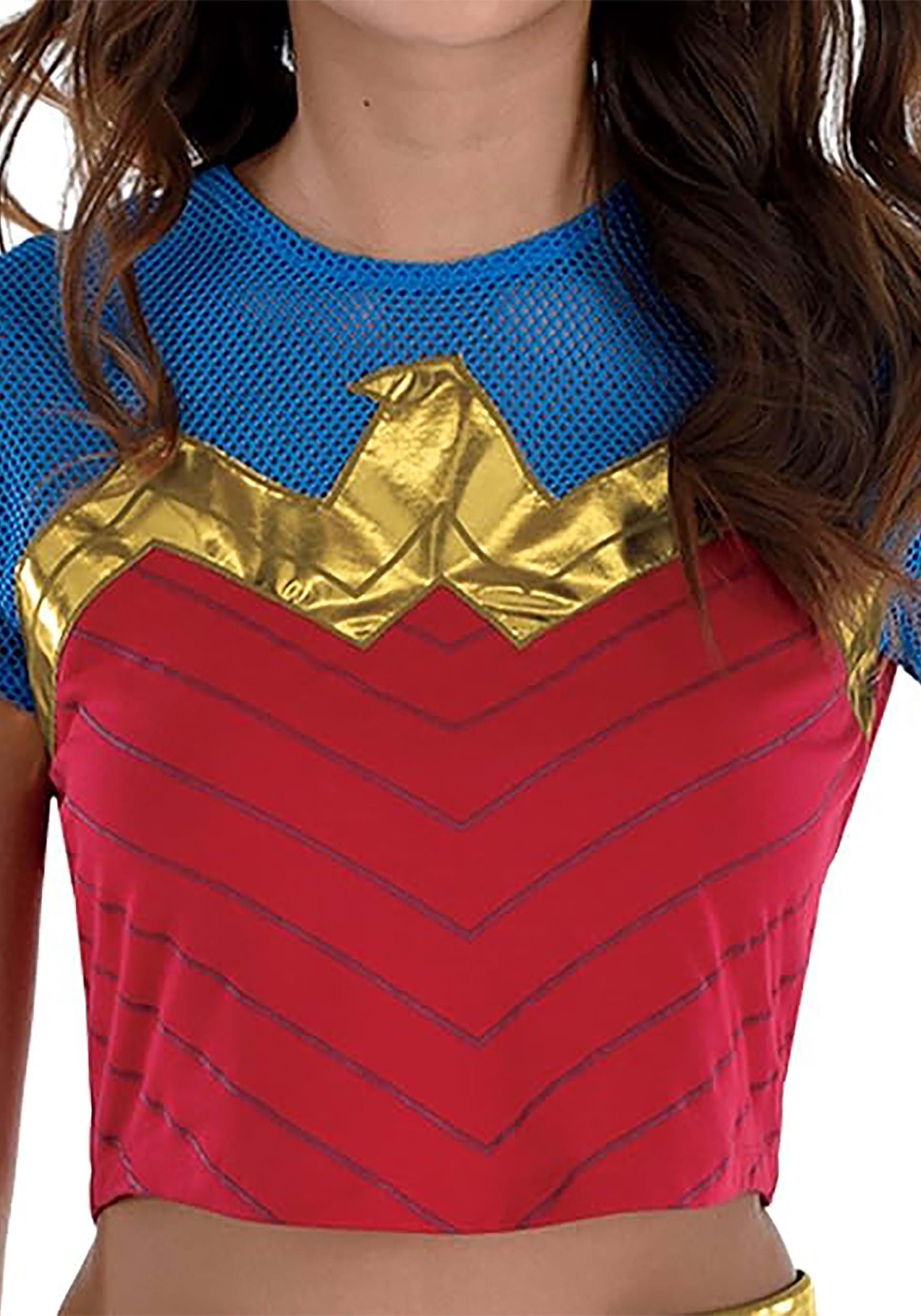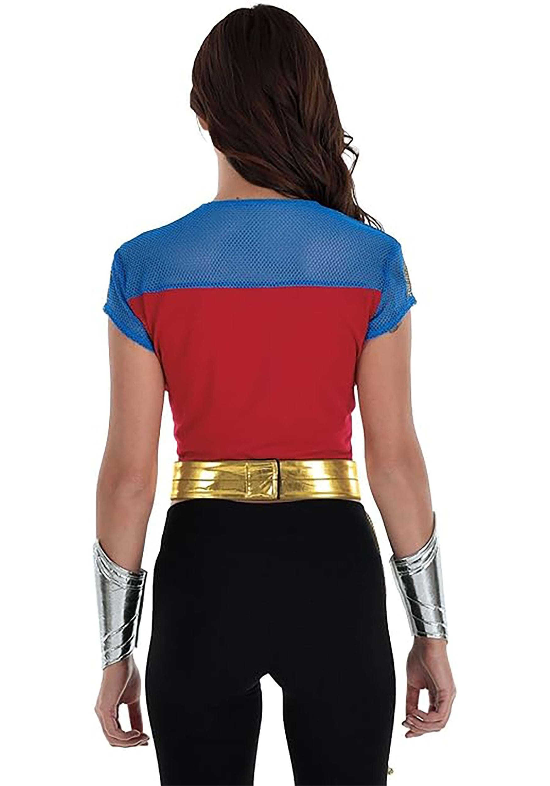 This officially licensed kit includes everything you need to capture Wonder Woman’s signature look—just add your favorite pants and you're good to go. The red and blue crop top features a gold bird symbol across the chest, instantly recognizable to every hero (and villain) in the room. The gold headband matches the emblem and brings those classic warrior vibes, while the shimmering silver wrist guards add that essential Amazonian flair.